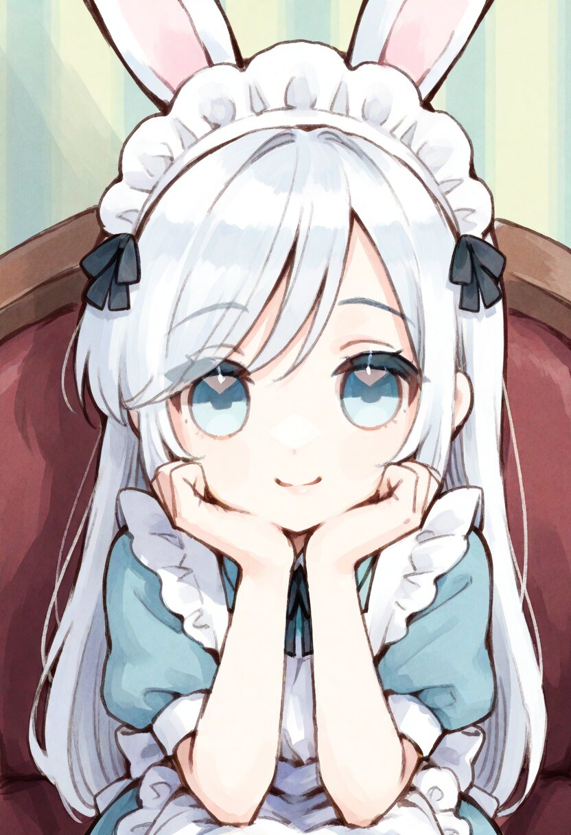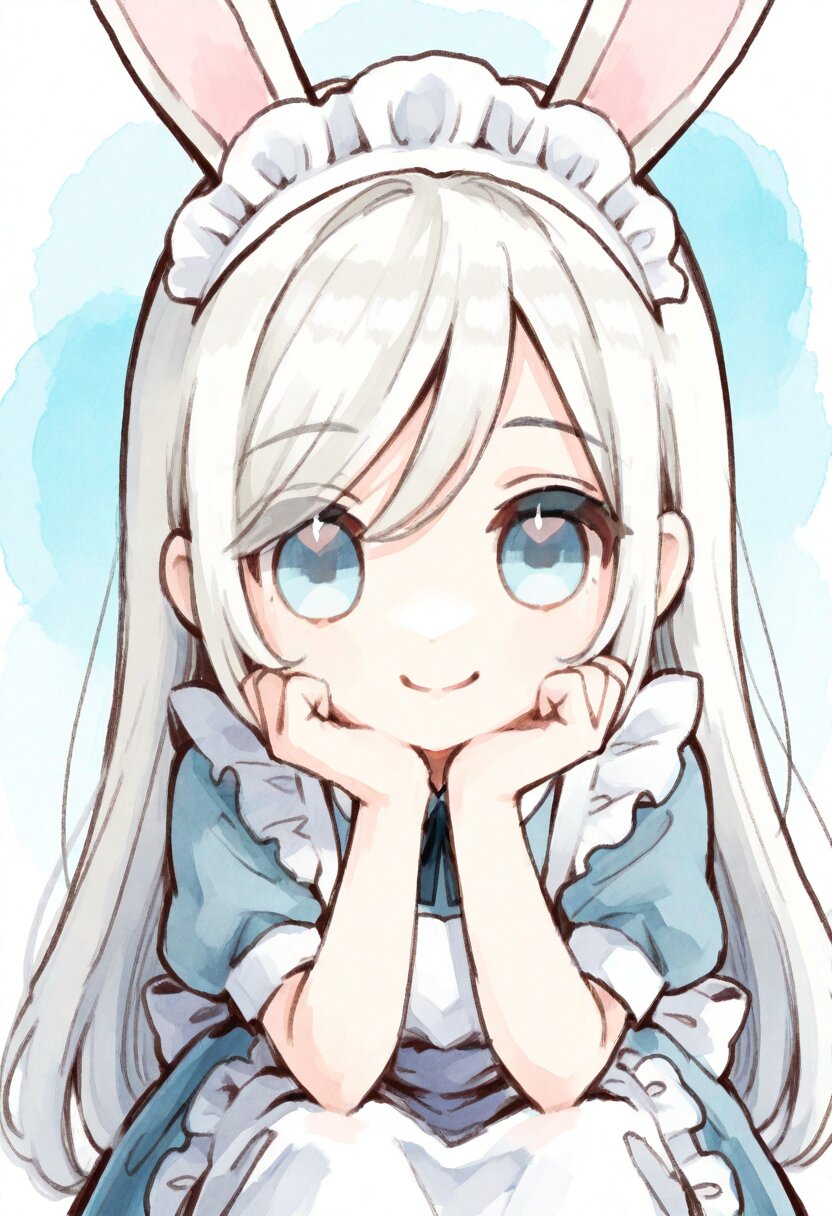 <lora:inmnstyleilxl:0.9>best quality, masterpiece, very aesthetic, watercolor painting, general, pastelcolors, 1girl, chibi, solo, white hair, long hair, light_blue_highlights_streaked_hair, light blue eyes, smile, rabbit ears, looking at viewer, maid, light blue dress, short sleeves, white apron, maid head wear, head rest, squatting, from above