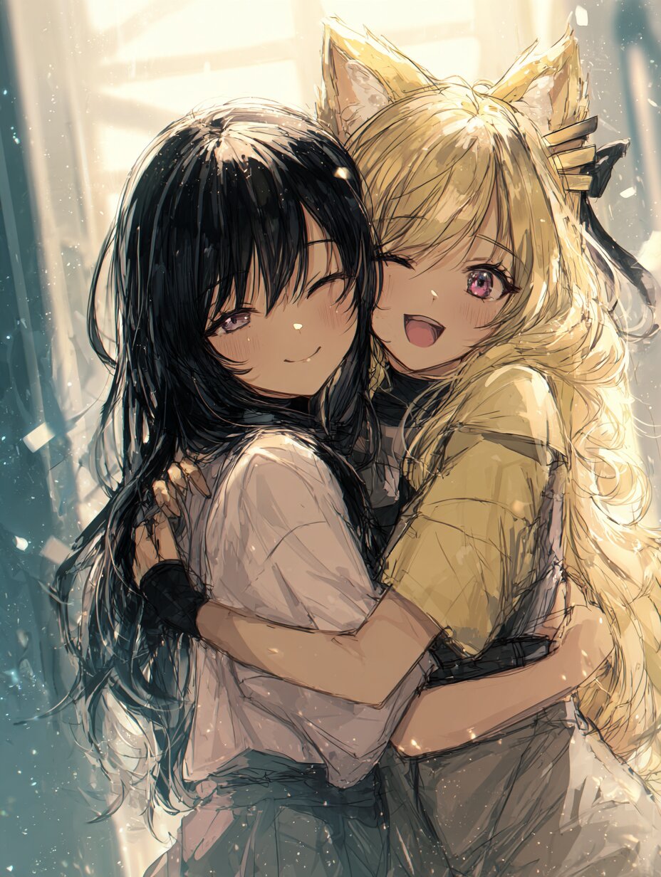 Anime style illustration of two young women embracing. The woman on the left has long, black hair, side bangs, and a gentle, closed-eye smile. She is wearing a light-colored top. The woman on the right has blonde and wavy hair, blonde fox ears, held back with clips, and a cheerful, open-mouthed smile. She is hugging the other woman from behind, with her arms wrapped around her. Both have large, expressive eyes with subtle reflections. The overall aesthetic is soft and warm, with a bright, slightly blurred background suggesting an indoor setting with natural light.