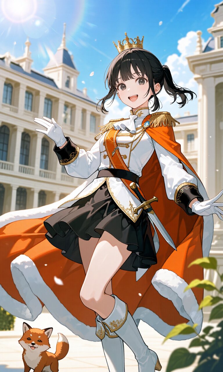 A 16-year-old young girl with a cheerful and lively personality stands confidently in a romantic neoclassical palace setting during a sunny afternoon. She has striking black hair styled in a single short ponytail and clear, expressive black eyes that sparkle with happiness. Her delicate face features a bright smile, showing her spontaneous and cute nature. She wears a (White luxurious Prince costume:1.6) with long sleeves, an (Orange luxurious Cape:1.3), and a (Black luxurious mini skirt:1.4). Her outfit is completed with (White luxurious boots:1.3), a (dagger on waist:1.3), and a (crown:1.3) atop her head, along with (White gloves:1.2). She strikes a cute pose, full of energy and charm. Behind her is an elaborate palace with grand neoclassical architecture, bathed in warm sunlight that creates soft sunbeams and lens flares. The vibrant blue sky features a faint rainbow, enhancing the light and joyful atmosphere. By her side is an adorable small fox cub, adding to the whimsical and magical tone of the scene. The image is insanely detailed, focusing on realistic textures in her clothing, hair, and surroundings while maintaining a dreamy, fairytale-like aesthetic.