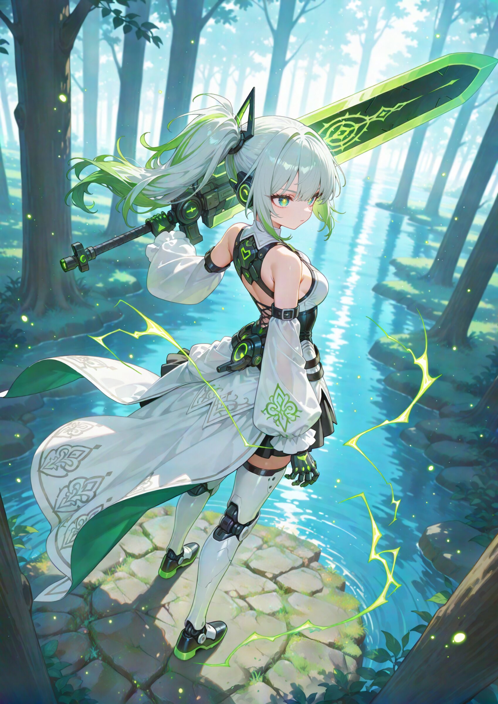 1girl, huge cool double blade in hands, holding huge cool weapon mechanism, machine, oblique angle, (from above:1.15) (25 years old:1.0), (medium breasts:1.2), (two-tone hair, grey and ever green hair, shoulder length hair, high side ponytail medium bangs:1.0), (beautiful face:1.1), (clear white small eyes:1.0), green pupils , fighting stance, weapon over shoulder, (mechanical black hands:1.0), black robot ears, , (mechanical white legs:1.1), white mechanical thighs, neon trim, medieval times fantasy world, (cybernetic gynoid:1.0), (mech suit:1.0), (white gothic cuirass:1.0), (robot joints:1.0), (white gorgeous modest wizard's dress skirt:1.1), , glossy silver body with metallic luster cyborg, bare shoulders, (Decorative embroidery:1.0), (white gorgeous dress:1.1), (overskirt:1.0), (white sleeve:1.2), electrokinesis, (looking away:1.0), from behind, (huge colorful ever green silhouette of leopard,serious monster silhouette:1.2), In the Western fantasy world, a forest exists as a paradise of mystical life. Tall trees reach towards the heavens, with soft rays of light filtering through the leaves. Deep within the forest lies a sanctuary where ancient spirits dwell, and magical events occur routinely. The air is pure, the water filled with pure energy, allowing visitors to feel the forest's power. This forest serves as a source of inspiration for adventurers, poets, and dreamers alike., blurry background, super fine concept art, hard surface, 8K, masterpiece, best quality, amazing quality, very aesthetic, absurdres, professional art lots of details, , overexposure, shiny-glistening, (watercolor style:1.0), (pastel color style:1.0) 4ur4_illu,shiny, glowing, glowing particles, glowing light particles, light particles, <lora:noline (1):1.0> <lora:sdxl2-flat2-512b:-0.2> <lora:facelightup_xl_v10:0.5> <lora:V2_yakumo_alchemy:0.5> <lora:Aura_illu:0.1>