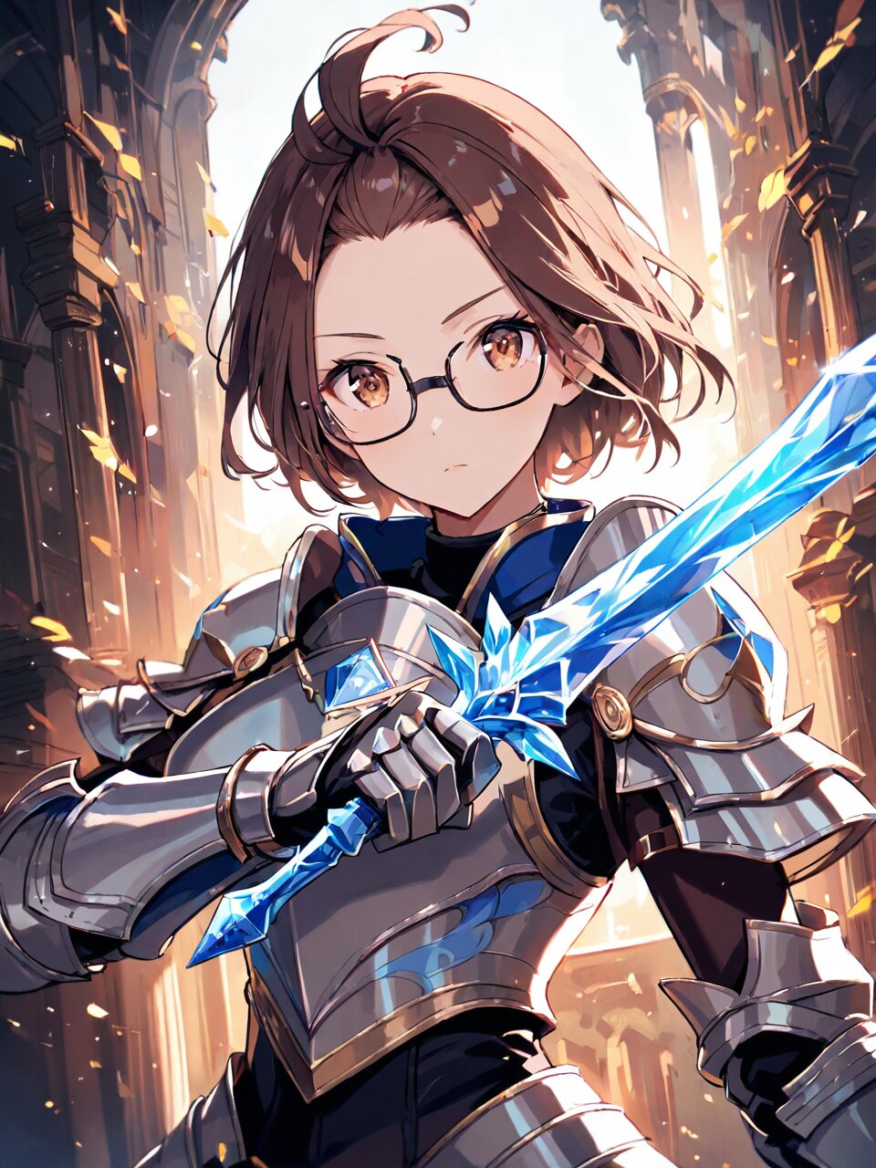 lady, forehead, glasses, brown hair, brown eyes, short hair, perfect crystal sword, fantasy style, knight, cool pose, dynamic angle