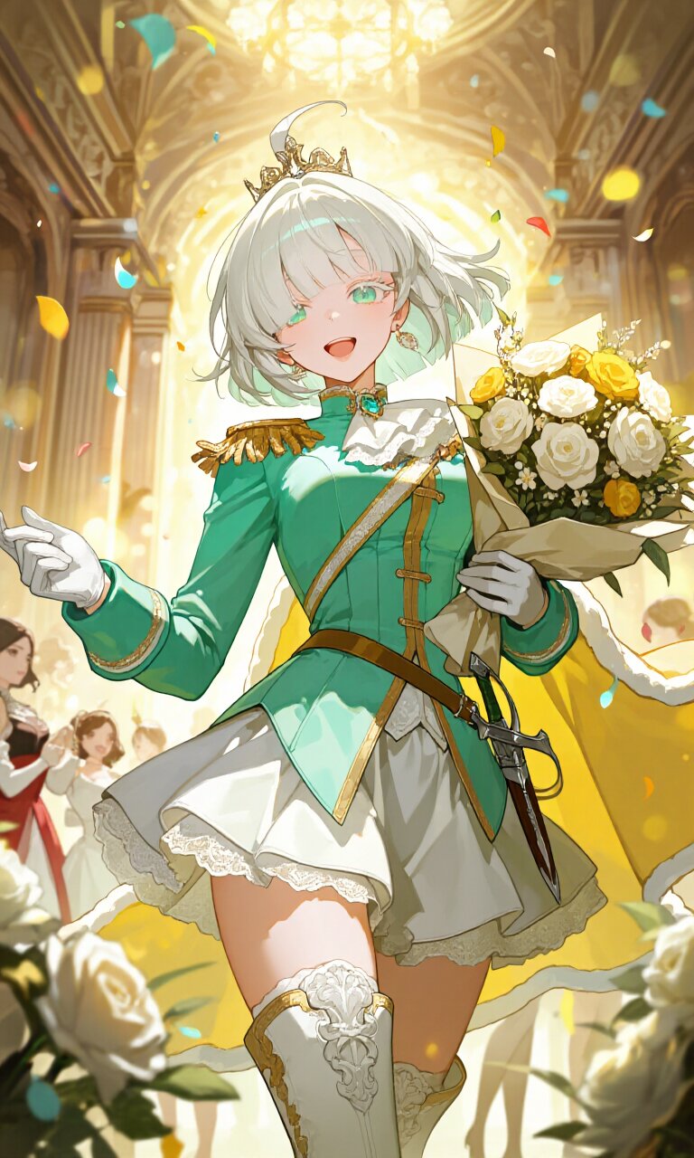 A stunningly detailed 16k masterpiece depicts a beautiful young woman with bright white short hair featuring blunt bangs and an ahoge, her mint-green eyes sparkling with joy. Her (white colored eyelashes:1.2) flutter delicately, and her hair slightly obscures one eye (hair over one eye:0.8). She wears a (Pale green luxurious Prince costume:1.5) with long sleeves past wrists, adorned with intricate lace jabot and (White gloves:1.2). A (Pale yellow color luxurious Cape:1.3) drapes elegantly over her shoulders, complementing her (luxurious mini skirt:1.3) and (White luxurious boots:1.3). A gleaming (dagger on waist:1.3) and a delicate (crown:1.3) complete her princely attire. She smiles radiantly with an open mouth, (holding a bouquet in hand:1.5) in a grand rococo-style palace ballroom, bathed in warm light and lens flare. The scene is filled with (lots of flowers), dreamy bloom effects, and ornate architecture. She is (surrounded by friends:1.8), all dressed in romantic academia fashion, celebrating in a light, joyful atmosphere. The composition blends hard-edged details with a soft, ethereal glow, enhancing the romantic and fantastical mood.