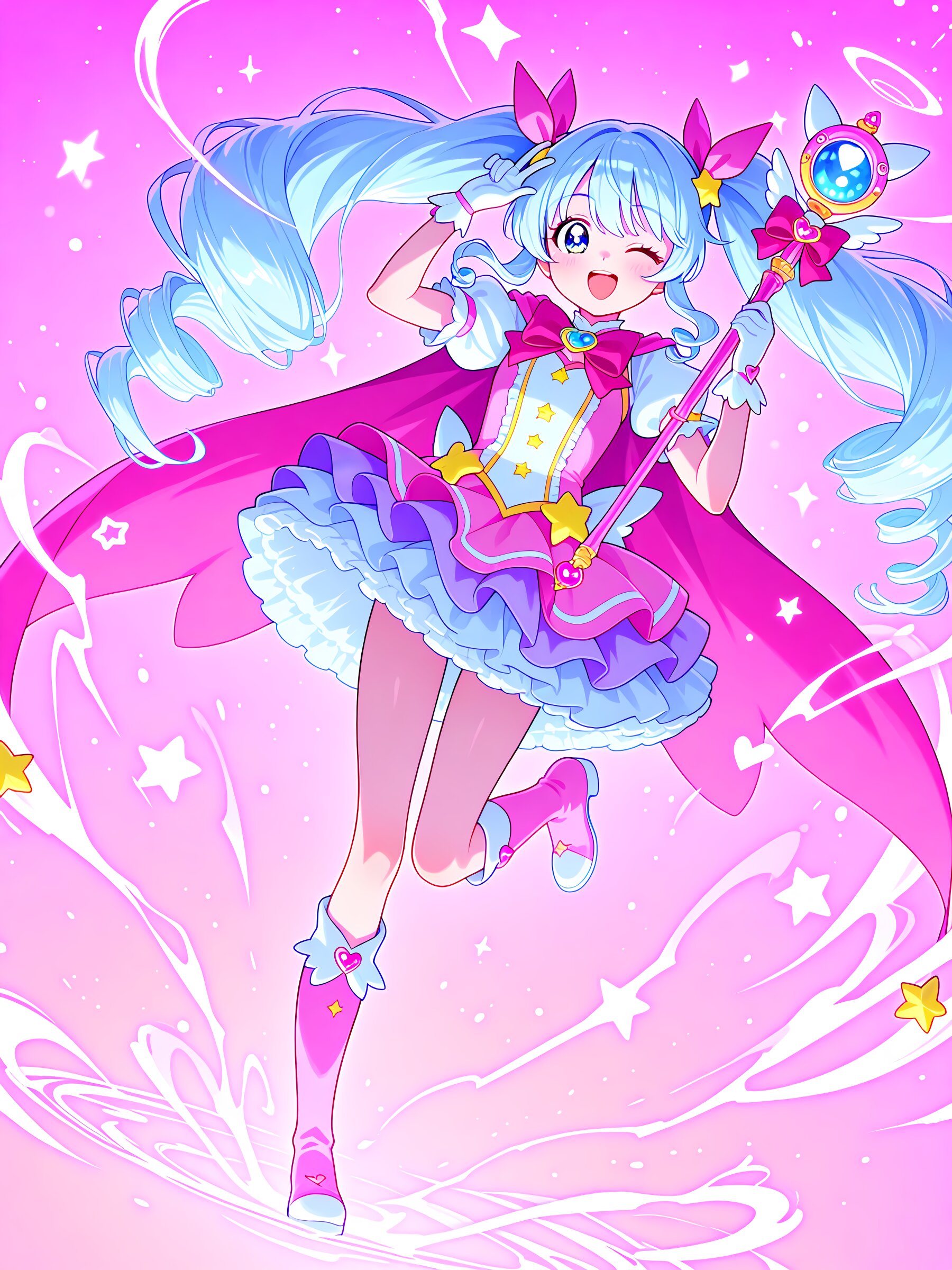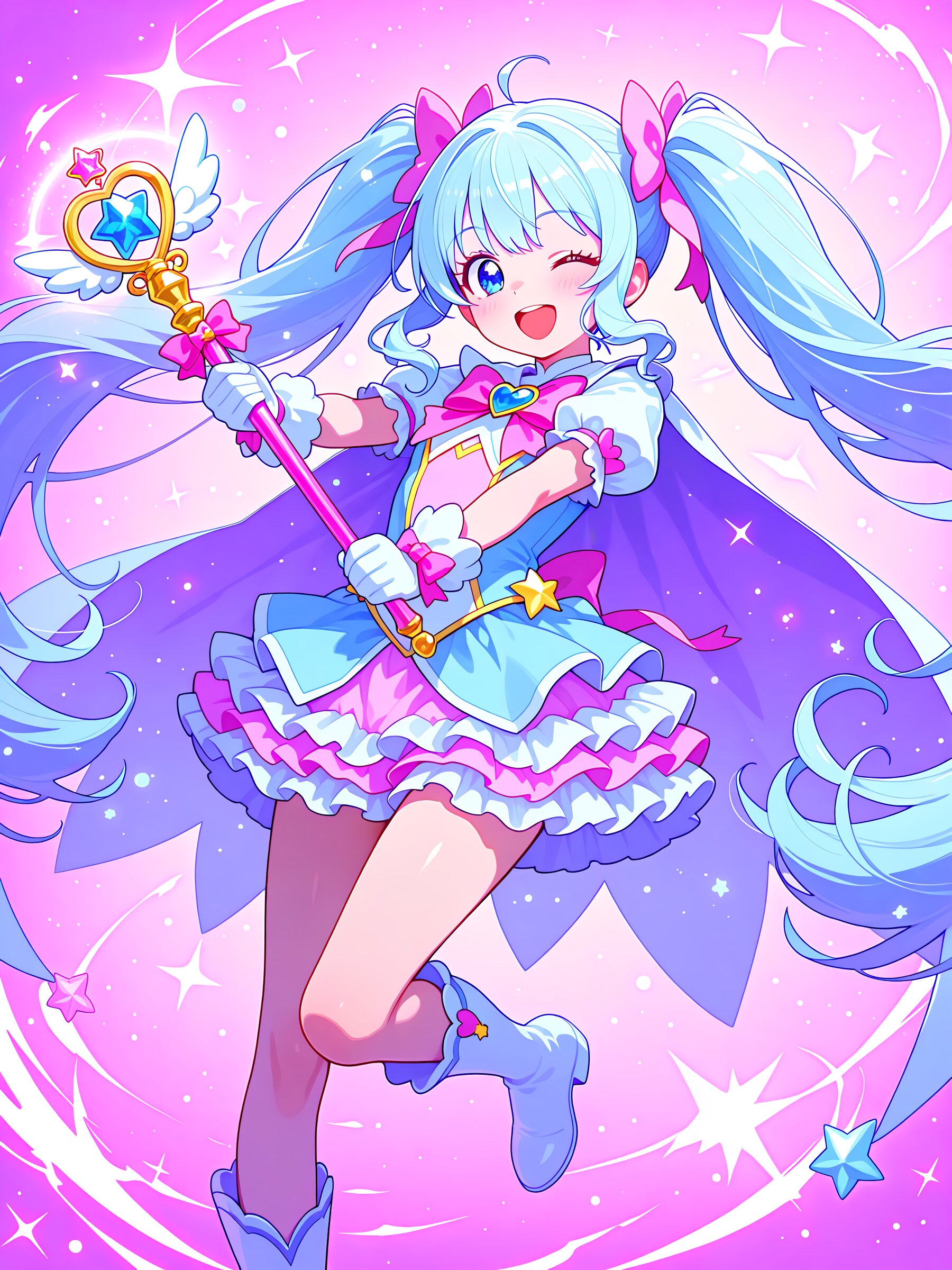 1girl, solo, round face, childlike face, (large eyes:1.2), drooping eyes, sky blue eyes, wavy fluffy long hair, light blue hair, twintails, small build, very thin, very thin legs, cute, big smile, open mouth, dynamic pose, Bend one leg, looking at viewer, one eye closed, dynamic angle, with magical cat, magical girl outfit, pastel colors, frilly dress, layered skirt, ribbons, puff sleeves, heart motifs, star motifs, gem decorations, thigh-high boots, gloves, glowing accents, magical aura, elegant cape fluttering, holding a magical wand, star tip wand, gemstone core, swirling light around the wand, sparkling particles, soft glow, floating runes, dramatic lighting, fantasy style, cute and heroic atmosphere, pale pink background, beautiful face, beautiful eyes, beautiful hair, best quality