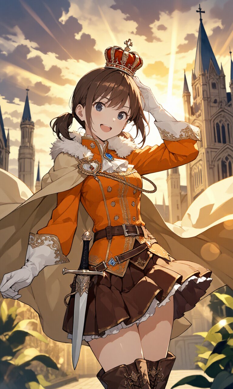 1girl, a 16-year-old girl with short brown hair tied into low twintails and captivating dark blue eyes stands in a majestic golden-hour sunset before a gothic palace. Her (luxurious Orange Prince costume:1.6) features intricate embroidery and layered fabrics, complemented by a (Beige luxurious Cape:1.3) that billows dramatically. She wears a (Brown luxurious mini skirt:1.4) with delicate pleats, (Baige luxurious boots:1.3) with ornate buckles, and (White luxurious gloves:1.2) that reach her elbows. A gleaming (dagger on waist:1.3) rests in its sheath, while a jeweled (crown:1.3) adorns her head. The girl strikes a cute pose with one hand playfully touching her crown, beaming with a radiant smile that highlights her beautiful, delicate features. Every detail is exquisitely rendered - from each strand of her shimmering hair to the fine textures of her luxurious attire. Sunbeams filter through dramatic clouds, casting lens flares and bathing the scene in a nostalgic, romantic academia atmosphere. The gothic palace towers behind her with elaborate spires and arches, its stonework glowing in the warm light of sunset.