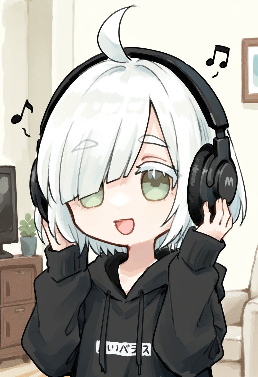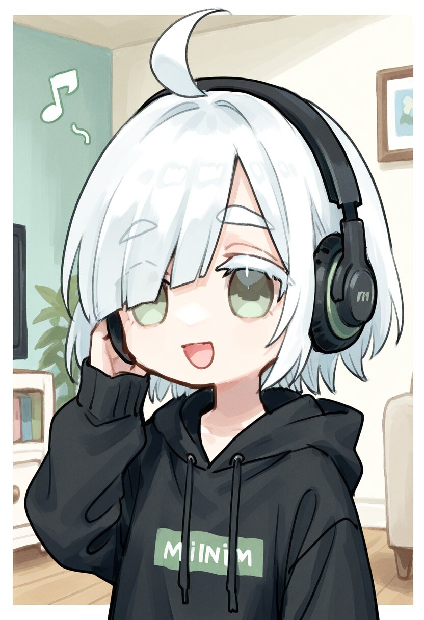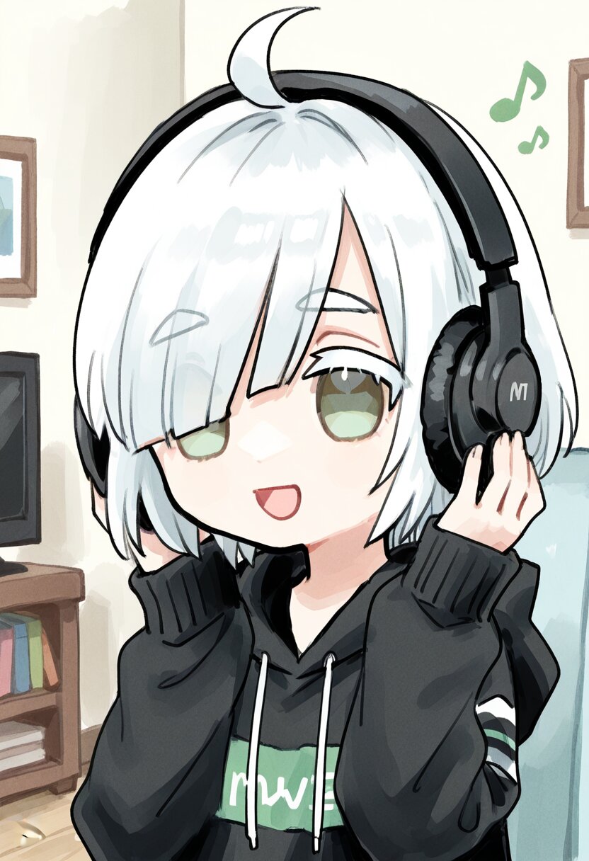 <lora:inmnstyleilxl:0.9>, best quality, masterpiece, very aesthetic, watercolor painting, general, 1girl, chibi, solo, (bright white hair), short hair, blunt bangs, white thick eyebrow, white colored eyelashes, (hair over one eye), ahoge, mintgreen eyes, headphones, hand at headphones, oversize black hoodie, sleeves past wrists, portrait, living room, musical notes, smile, open mouth