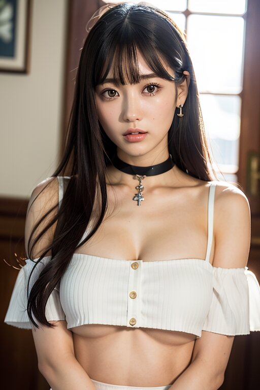 masterpiece, extremely detailed illustration, Japanese woman, 23yo, thin, tall, perfect proportions, extremely detailed body, cute, pretty, hyper detailed face, hyper detailed eye, beautiful eye, medium hair, bangs, upper body, blouse, choker, lower body, panties, kneehighs, in room, hyper detailed background,