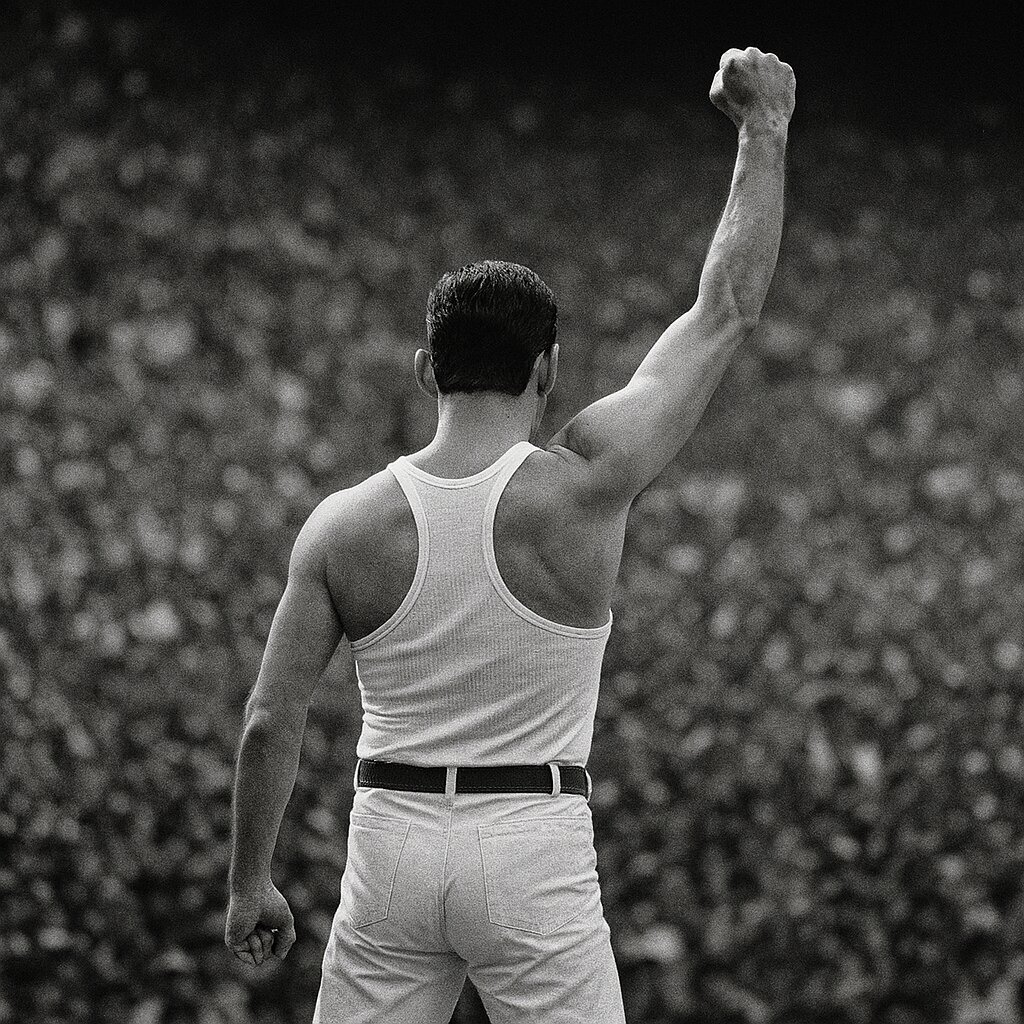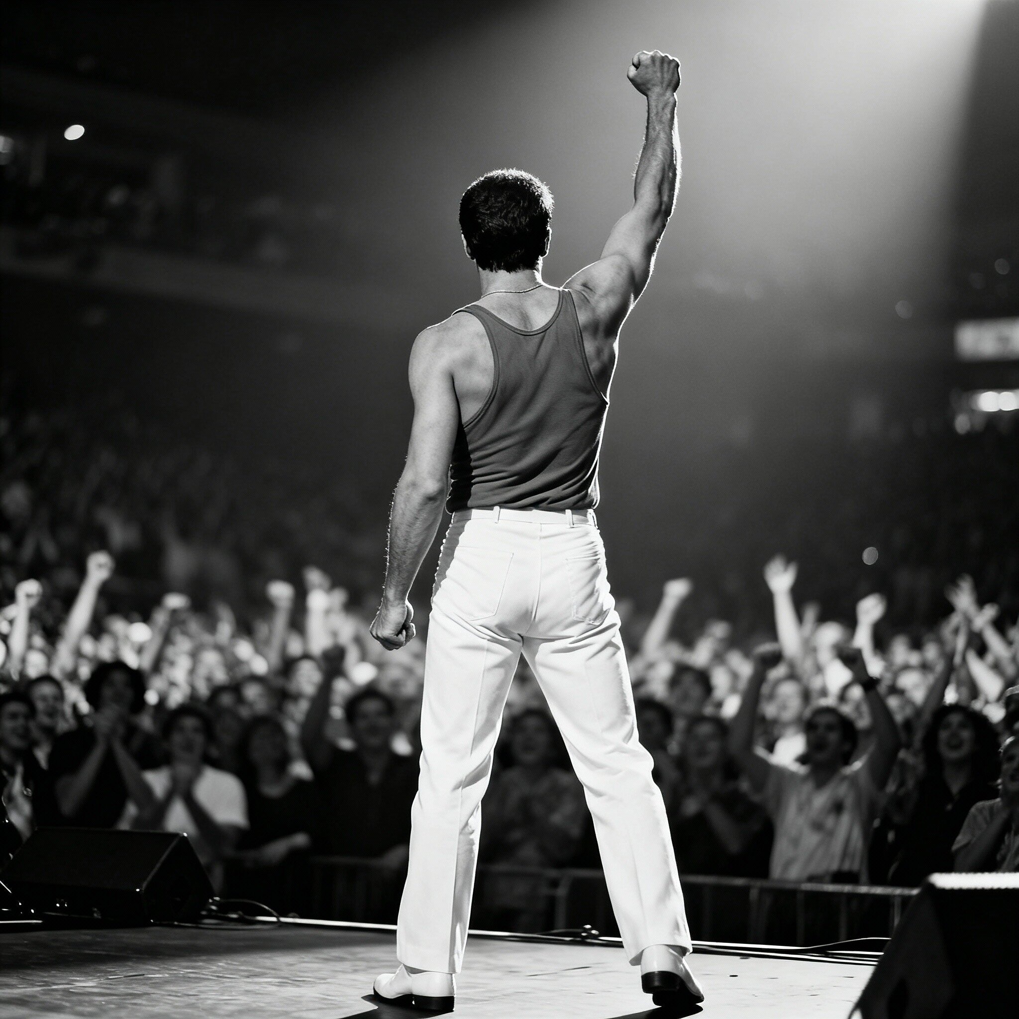 A photorealistic black and white 4:3 image of a short-haired man seen from behind, wearing a tank top and white long pants. He stands on a stage with one arm raised in a clenched fist, confidently acknowledging the presence of the audience. The scene is captured in high detail, with dramatic lighting and shadows emphasizing the contours of his muscles and clothing. The background shows a cheering crowd in soft focus, evoking a powerful and iconic concert moment.