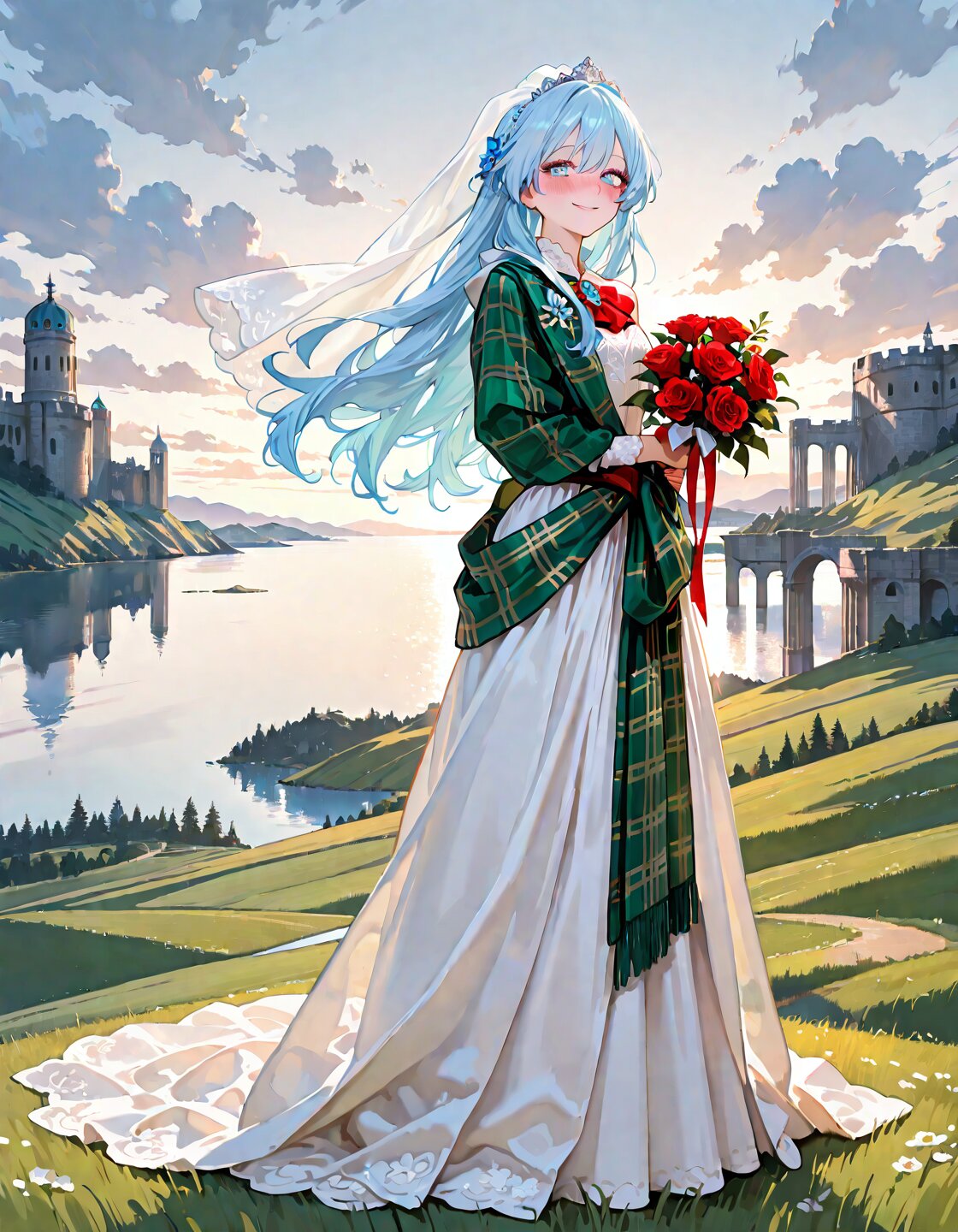 1girl,(bride:1.3),light blue hair, long hair, blushing, round face, childlike face, (large eyes:1.2), drooping eyes, sky blue eyes, wavy fluffy long hair, small build, very thin,beautiful face, beautiful eyes, beautiful hair, delicate face,detailed face,detailed skin,detailed hair,masterpiece,best quality,insanely detailed,beautiful,16k,photorealistic,exquisite,absurdres,folk art,romantic academia,vibrant academia,happy,smiling,looking at viewer,standing,wearing a delicate classical white wedding dress with lace details,wedding vail,(traditional Scotish Green tartan long sash draped over one shoulder and secured with a brooch:1.4),a soft blue accessory ("something blue"),flower hair ornament,holding a bouquet of roses,full body,outside,Scotland,hillside,ancient Citadel,lake,in the afternoon,cloudy sky,windy,bloom,soft lighting