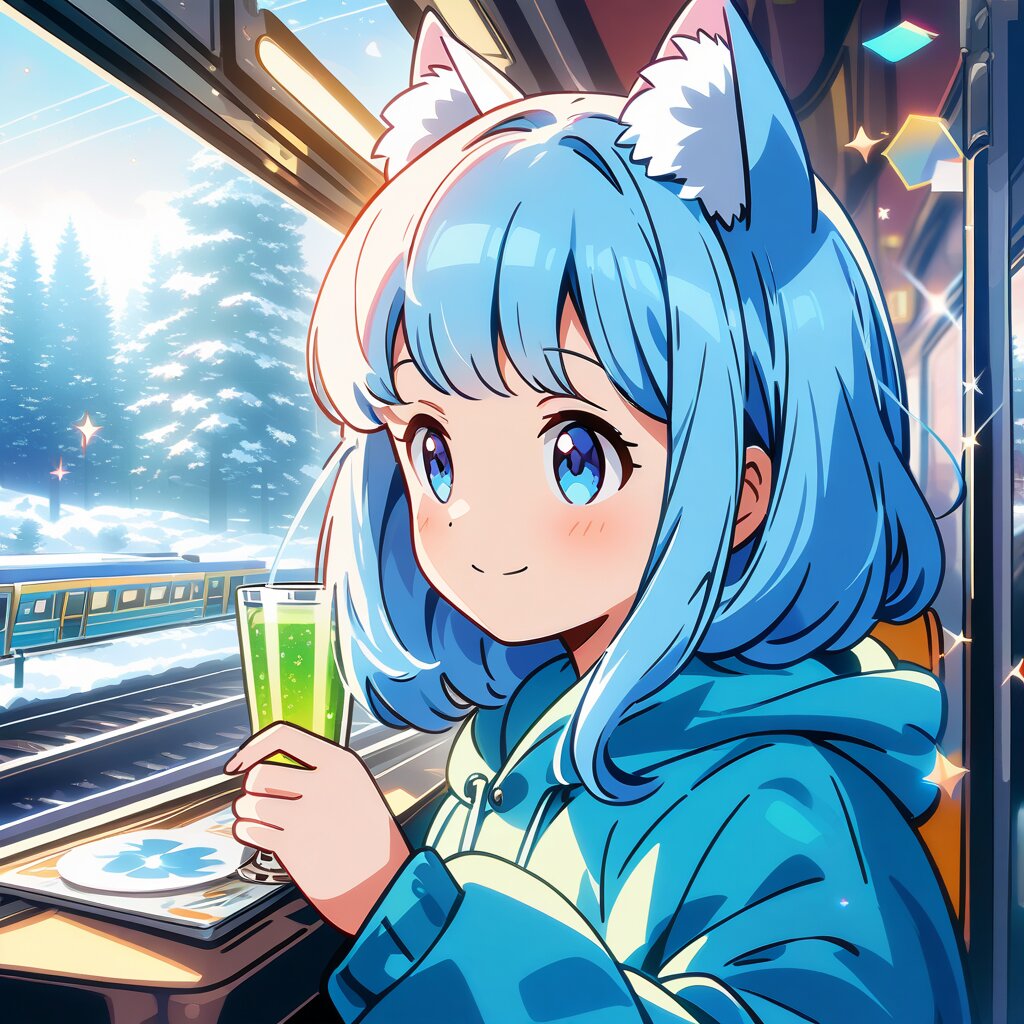 girl,Train running along fairy forest in art stamp style, seats, tables, drinks, train journey, close up of girl sticking her head out of window enjoying the scenery, girl with cat ears and winter clothes, sparkles (anime style) (familiar face), delicate gestures, smiling girl, bright blue and white tones, very detailed.