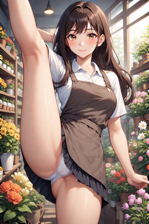 友人の結婚式用の花束を買いに、街角の花屋「フローラル・ハート」に飛び込んだら、店員はなんと幼馴染の美咲! しゃがんで花瓶に水をやる彼女、チラリとパンチラにドキッ!「おっと、どこ見てんの?」と、子供の頃のいたずらっ子な笑顔で僕をからかう。花束選びでは、美咲が棚の奥のトルコキキョウを取ろうと前屈み。またパンチラ!「花に集中してよ!」と笑う彼女に、気まずさも吹っ飛ぶ。昔のノリそのままだ。そして極めつけは、リボンを取る瞬間。「見てて、特別サービス!」と、彼女がニヤリと笑ってわざとハイキック! スカートがふわり、パンチラがチラリ!「どう? 花より目立つでしょ?」と満面の笑顔。いたずら心全開の美咲に、僕も爆笑。AIイラスト集は、そんな美咲の魅力炸裂。しゃがむ姿、前屈みの真剣さ、わざとハイキックのキラキラ笑顔――花屋の花と彼女の輝きが詰まった一枚。花束を受け取り店を出る僕の心は、まるでヒマワリの花畑みたいだった。
