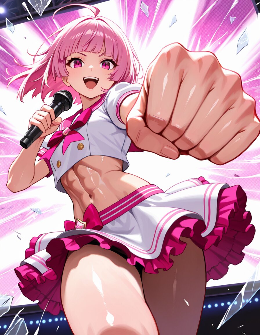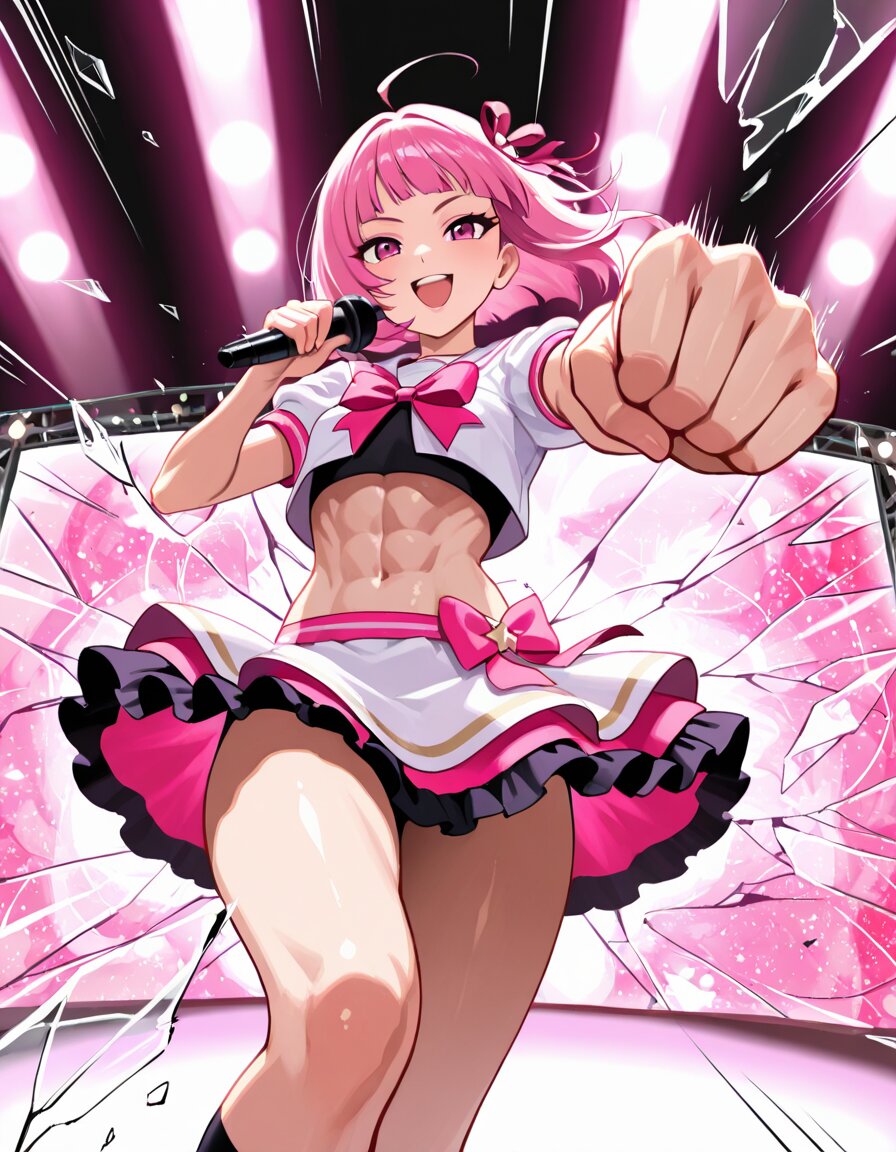 (masterpiece, best quality, insanely detailed, beautiful, 16K), 1girl,thigh-up,(from thighs upward),ahoge,hime cut,straight pink hair, (short hair:1.1),dark pink eyes,delicate face,detailed face,detailed skin,detailed hair, (slightly defined abs, subtle toned midriff:1.01),(idol-style school uniform outfit:1.2), (cropped top, exposing midriff:1.2),(pink-themed costume, cute soft pink accents), (frilled skirt, shiny fabric, ribbon details),(holding microphone, singing energetically:1.2), (punching toward the viewer:1.3),(fist in the foreground, strong perspective:1.3), (dynamic action pose, powerful punch motion),(smile:1.2),(broken glass shards across the entire screen:1.4), (full-screen cracking effect, dramatic impact:1.4),(splintered glass fragments flying outward:1.2), (impact sparks, strong motion lines), (soft glow, vibrant stage lighting, dynamic composition),floating hair,floating clothes,floating skirt,kawaii,(petite:0.9),