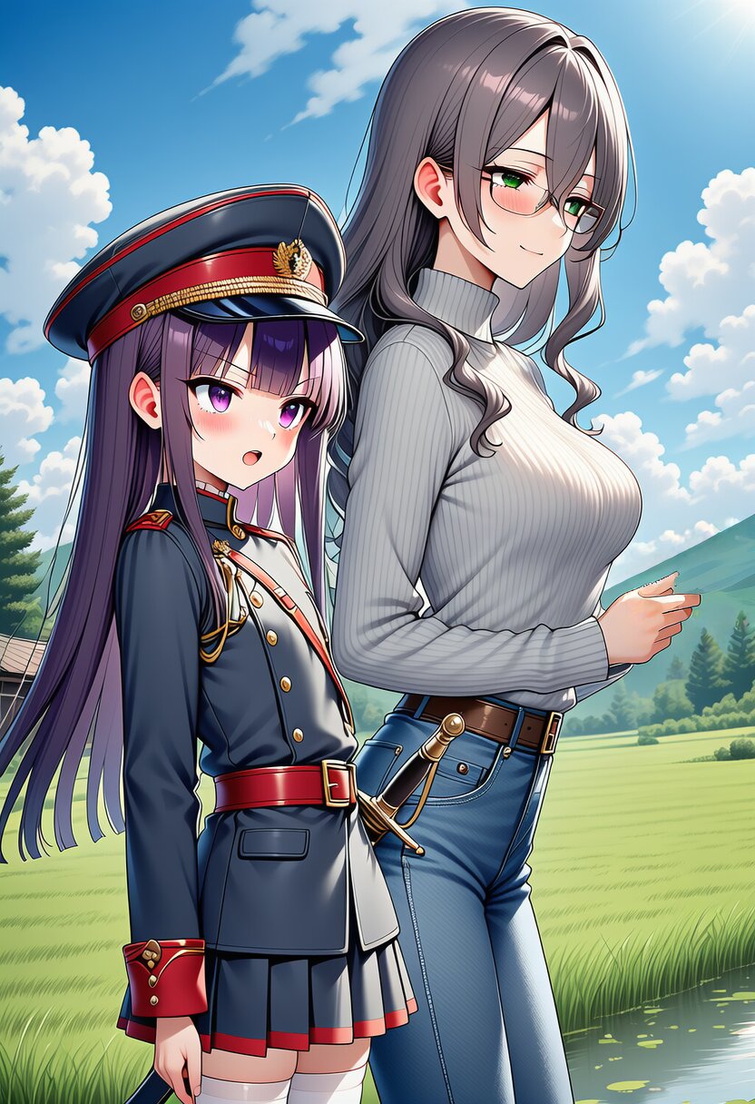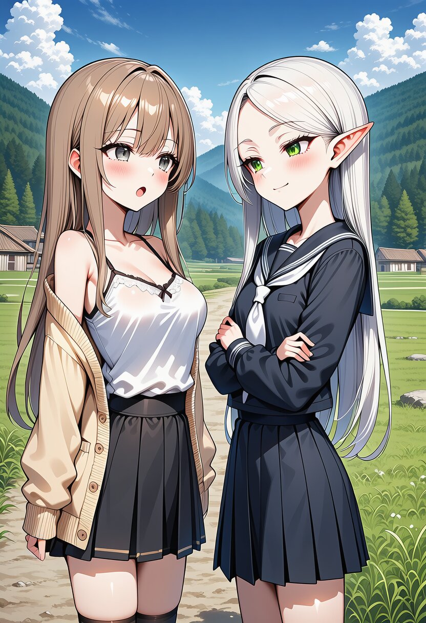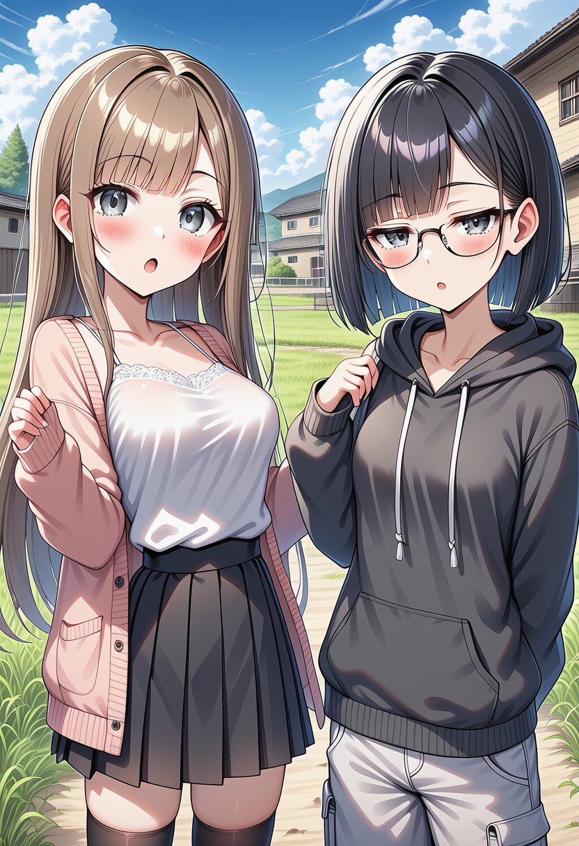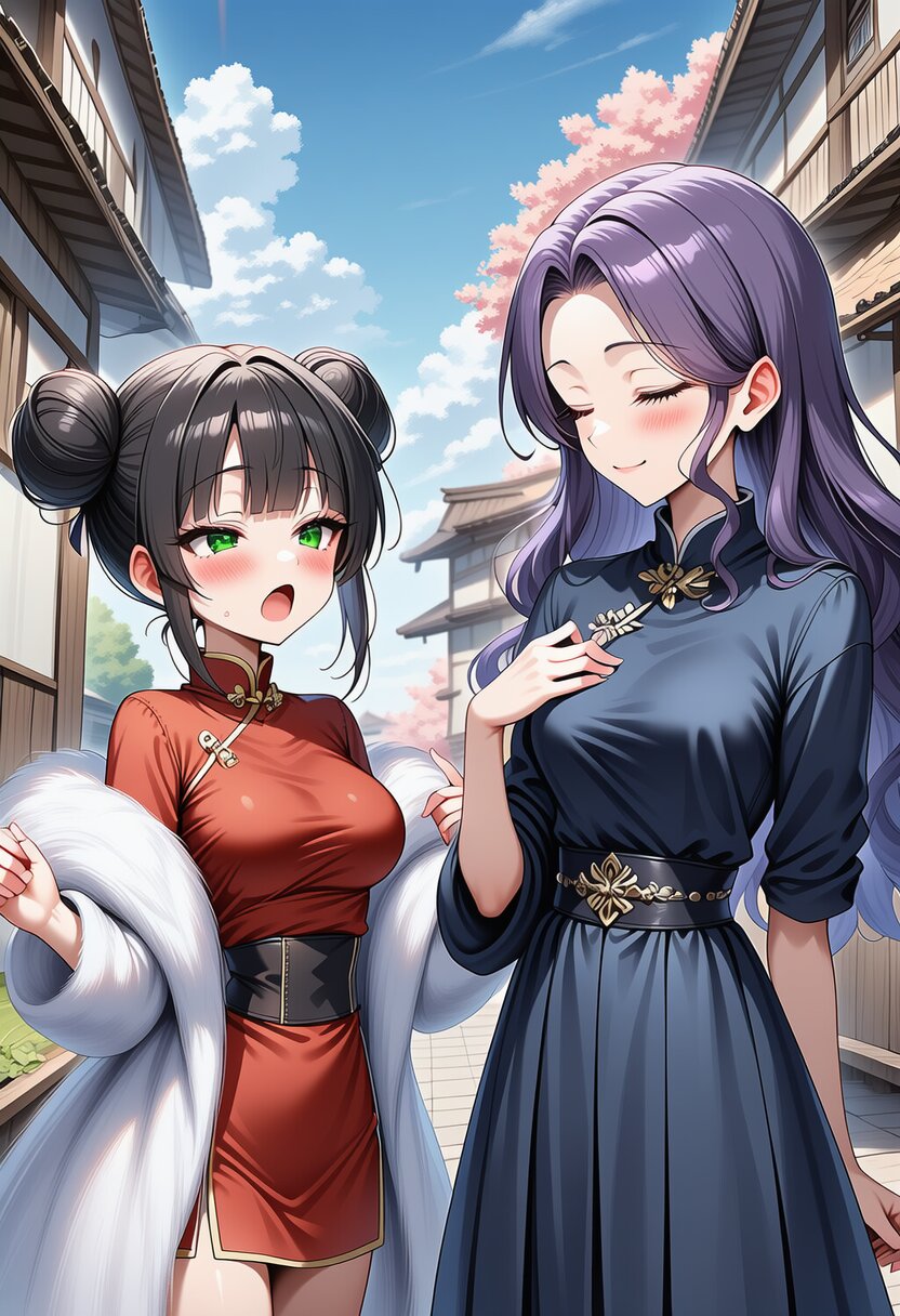 ai-generated, year 2024, anime style, 2girl, side by side, looking at viewer, midday, outdoor, in1.0::ancient residential area of the oriented countryside::, from front, masterpiece, best quality, ultra detailed, perfect fingers, high resolution, absurdres, perfect anotomy, detailed background, unity 8k wallpaper, location, very aesthetic, masterpiece, no text