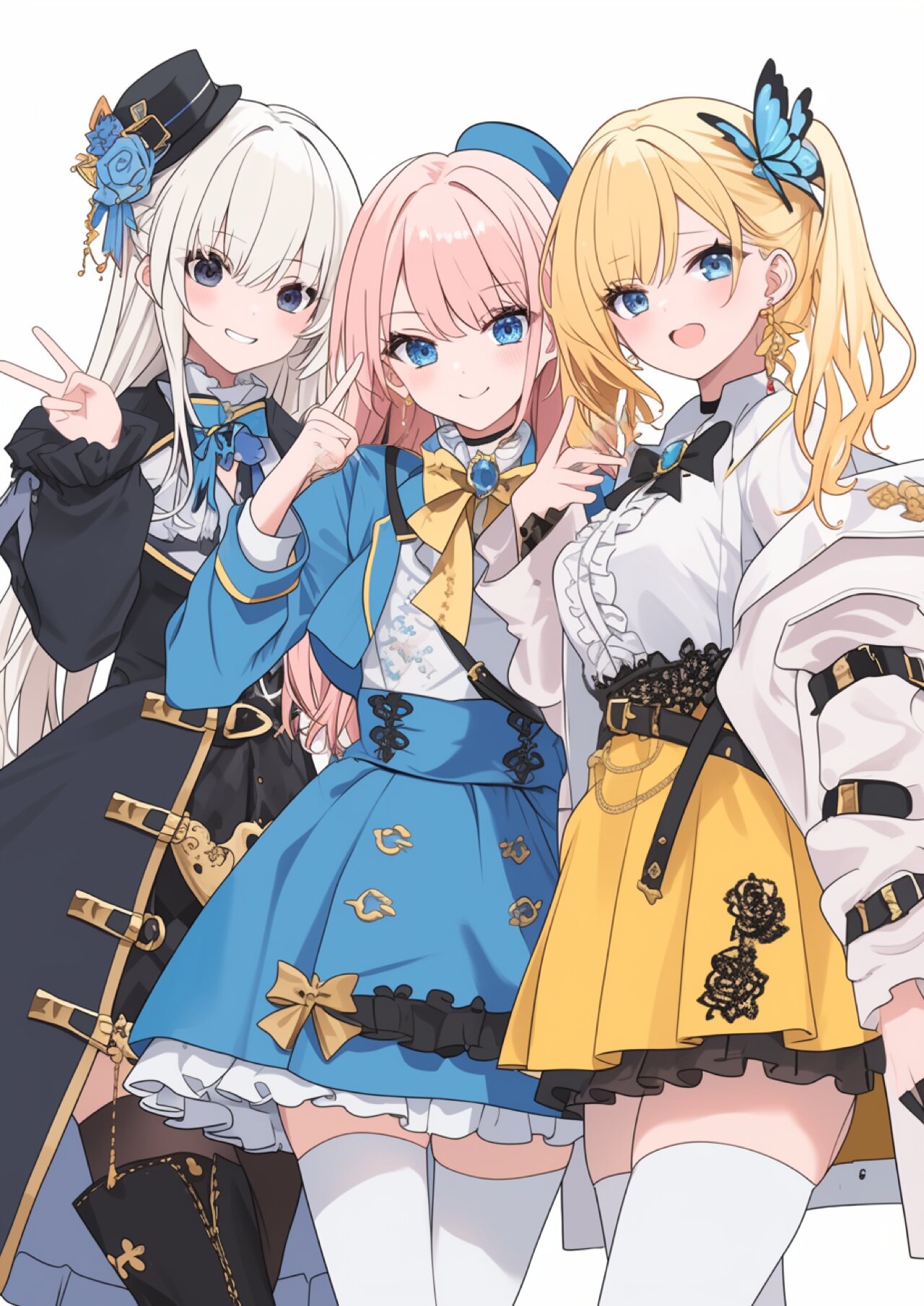 anime,portrait,3girls,plaid_skirt, blue_coat, long coat, blue jacket, gold trim, gold buttons, black cuffs, black collar, laurel embroidery, trench_coat, open_coat, two-tone_dress, blue_dress, yellow_dress, white shirt, yellow bow tie, high_heel_boots, black_footwear, white_thighhighs, gold pattern, black_headwear, mini_top_hat, mini_hat, top_hat, tilted_headwear, yellow_rose, white_rose, hat_flower, butterfly_hair_ornament , black lace leg accessory with matching stockings,--niji 6 --s 50 --raw --p yct9tpl --ar 5:7 --sref 22220500 --sw 4