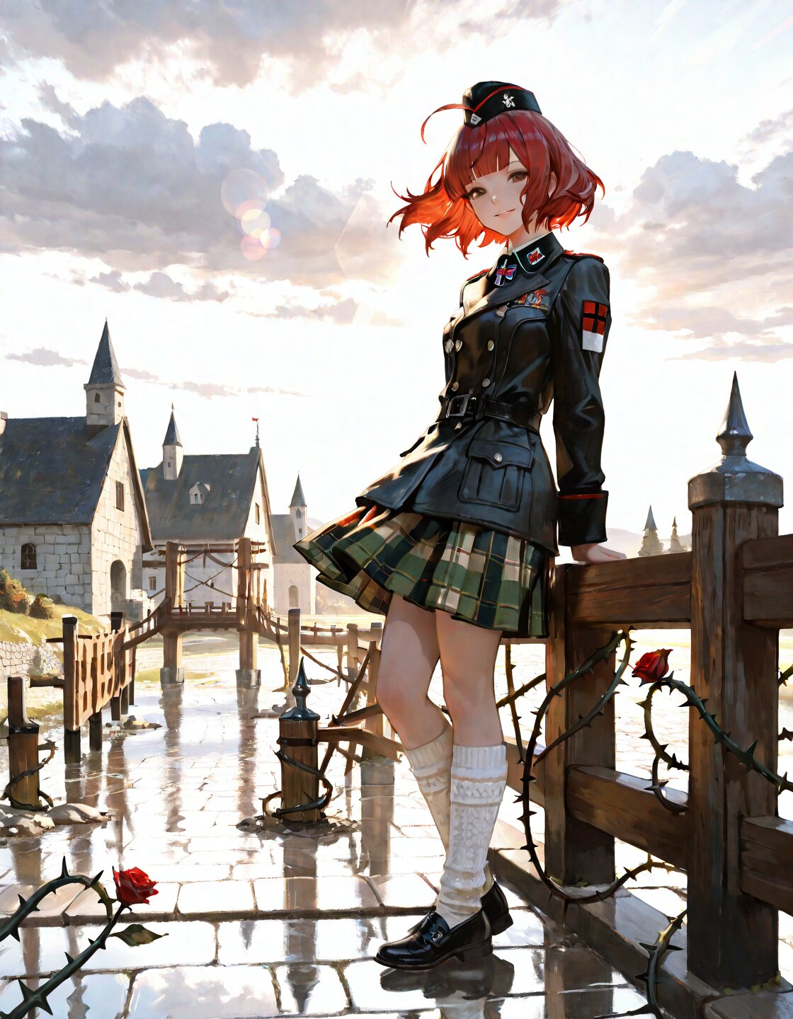 1girl,solo,red hair,ahoge, short hair,blunt bangs,silky smooth hair, brown eyes,beautiful face, beautiful eyes, beautiful hair, delicate face,detailed face,detailed skin,detailed hair,masterpiece,best quality,insanely detailed,beautiful,16k,photorealistic,looking at viewer,beautifully detailed hair,defined detailed face,beautiful detailed eyes,beautiful detailed clothes,proud,intelligent,smiling,leaning back,Leaning against a wall,crossed arms,standing bravely,(a black sporran on the front of Kilt:1.5),(wearing a traditional Scottish Khaki tartan kilt:1.7),( black formal military jacket :1.5),(garrison cap:1.4),(Ivory knit high socks:1.3),(Black oxford shoes:1.2),uneven cobblestone street ground with worn stones,stone castle, reflective moat, wooden drawbridge, gentle morning haze, clear reflection, medieval ambienc,Scotland,with a hill,with small roses,Thorns,cloudy sky,windy,floating hair,hazy atmosphere,chill atmosphere,lens flare,cloudy sky,bloom,dramatic lighting,in focus with blurred background,full body shot,portrait