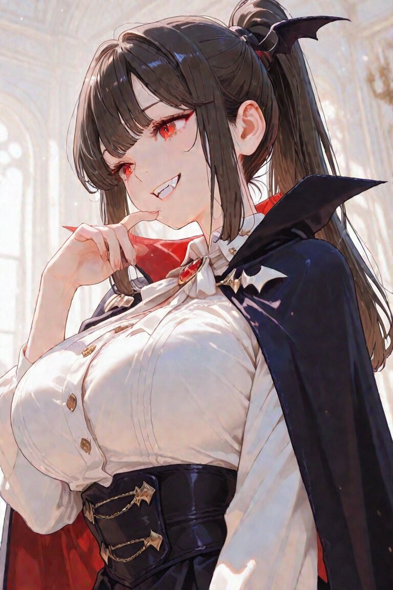 (best quality),(masterpiece),(ultra detailed),1 lady, long ponytail, brown hair, smile, big breasts, (vampire costume, double tooth)