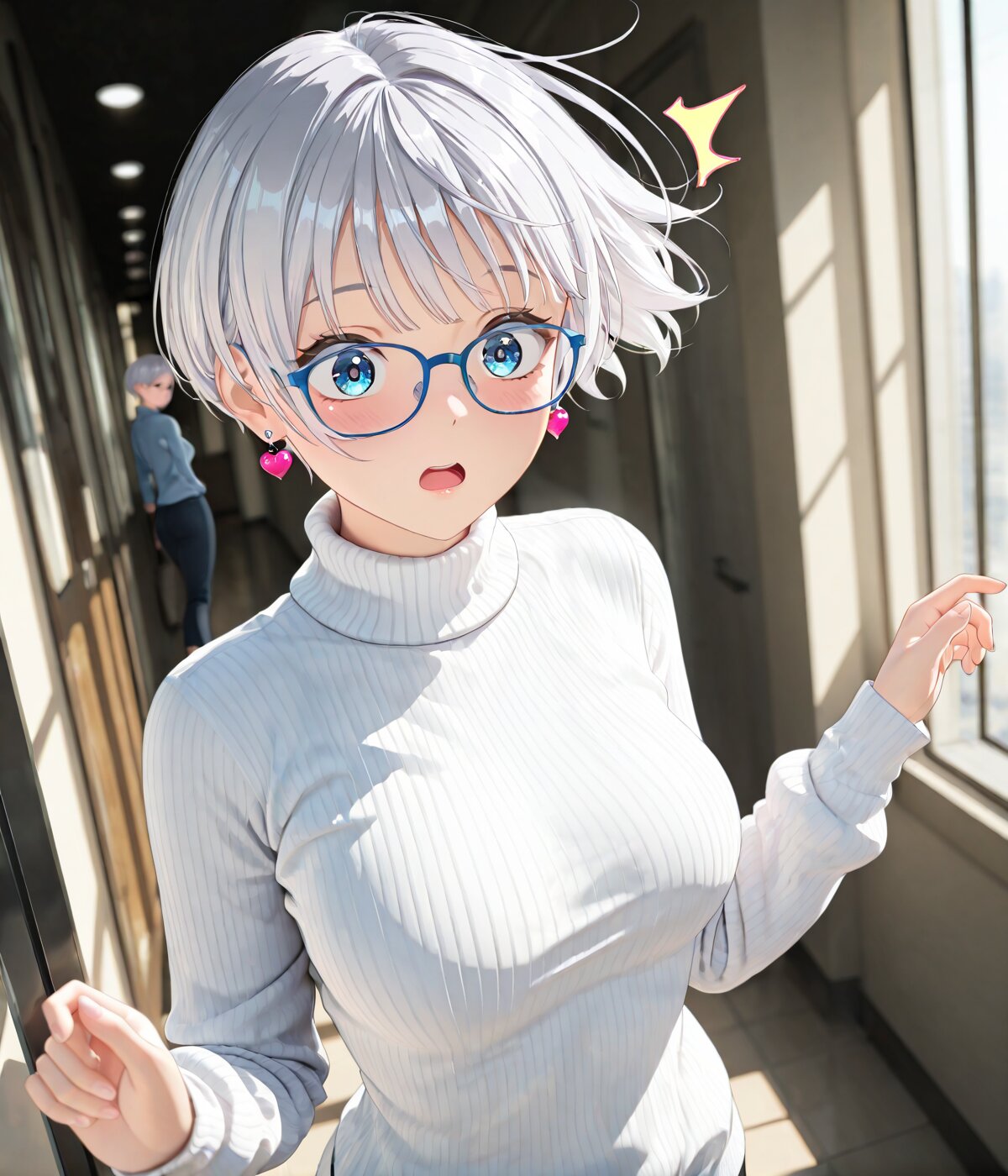 masterpiece, best quality, amazing quality, 4k, very aesthetic, high resolution, ultra-detailed, absurdres, newest, scenery, 3d, rendered, backlit, blue glasses, silver hair, very short hair, heart-shaped earrings, choppy bangs, surprised, blue eyes, white blue, 1girl, turtleneck sweater, medium breasts, full body, portrait, dynamic, modern urban renewal area, floating hair, BREAK, hands, fingers, vignetting, dramatic shadow, cinematic lighting, rim light, detailed background, depth of field, vignetting, volumetric lighting