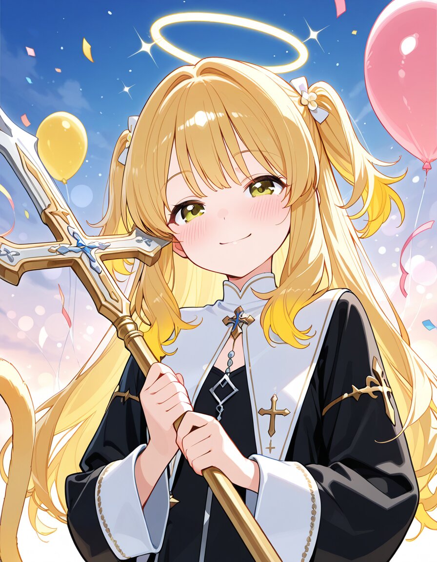(masterpiece, best quality, ultra-detailed, semi-realistic anime style:1.2, soft pastel colors, soft light, smooth shading, detailed but illustrated skin texture, cute and warm celebratory atmosphere), (young petite girl:1.25, small and slender body, gentle soft smile), (golden hair, twin-tail half-up hairstyle, natural highlights, soft flowing strands), (slight blush, expressive sparkling eyes), (wearing a black mini-skirted nun outfit with refined silver embroidery:1.1, clean fabric texture, subtle folds, cute holy motif accessories), (holding a large cross decorated with pastel ribbons and small sparkles), (a big shiny “100” pastel-colored balloon floating beside her), (confetti, floating pastel particles, soft bokeh light effects, subtle halo-like glow), (joyful, adorable, elegant semi-real illustration, celebratory mood), (background: soft pastel sky, gentle sparkles, light bloom, warm and cheerful)