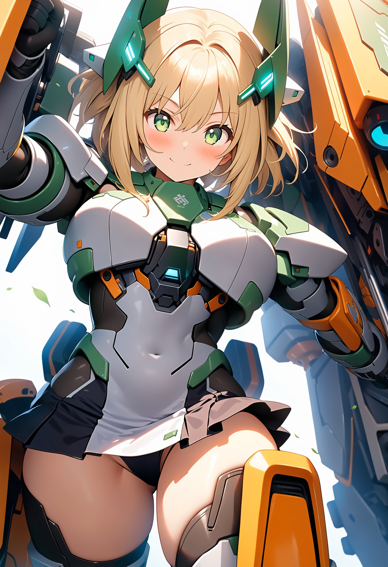 1girl, ((white background)), ultra detailed 8k cg render, masterpiece, high resolution, extremely detailed, mecha musume,mecha shoulder, mech leg, headgear, mecha armor, ((mini skirt)),long blonde hair, dropping green eyes, smile, dynamic posing,