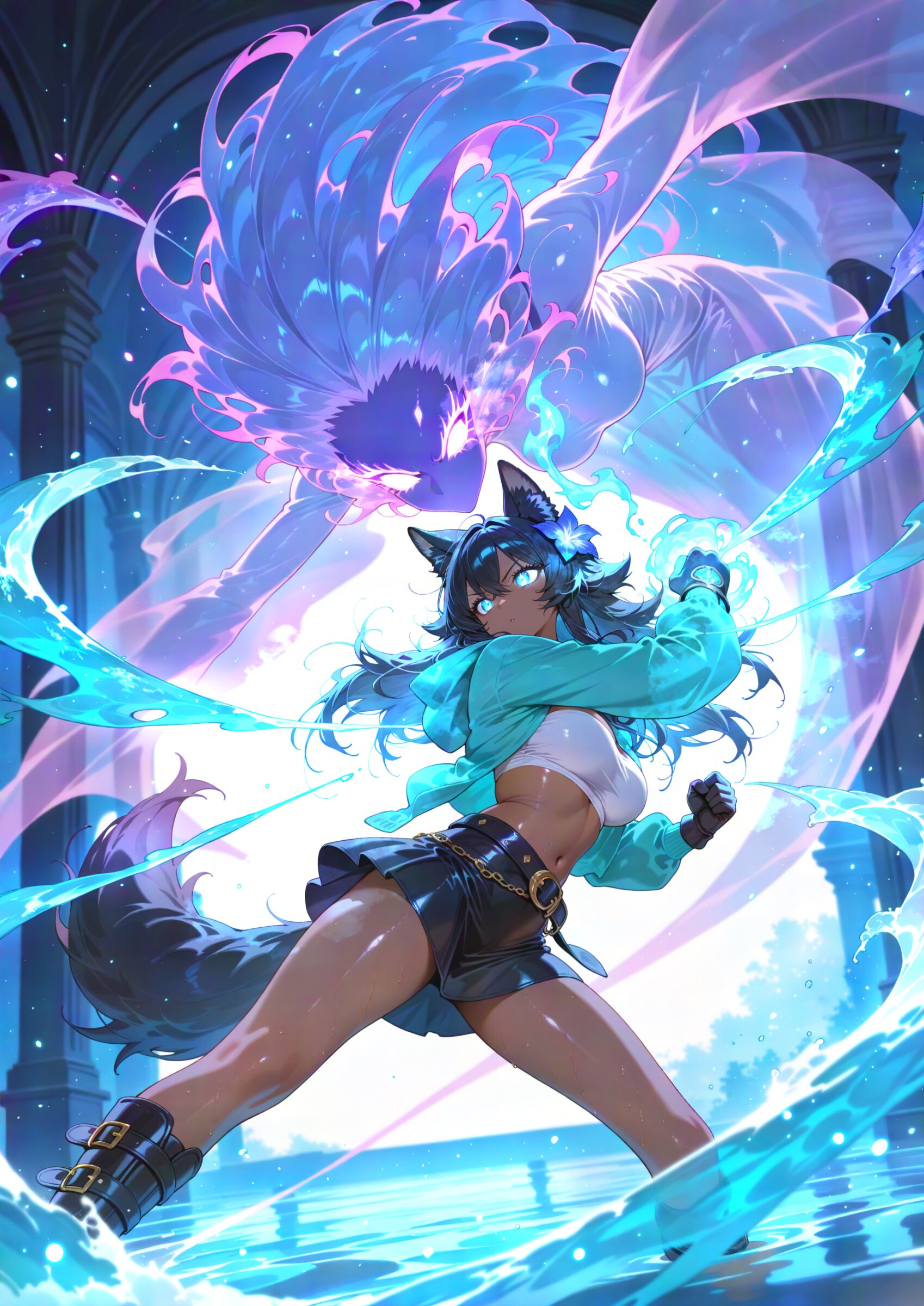 (face:1.0), (blurry foreground:1.1) from below from side facing away, looking at monster 1girl, black wolf ears, dark skin, young beautiful girl, large breasts, tall, wolf tail, (aristocratic features), (Black Hair:1.2) (disheveled long hair over ears:1.3) messy hair ornament flower, (perfect turquoise eyes:1.3) long eyelashes,, wearing turquoise hood down and white tube top leather gloves, lether miniskirt, belt boots, turquoise hoodie, water magic, , kung fu attack, kung fu pose, kung fu action, (swirling energy,energy magic,energy:1.2), Chinese bellflower, water magic, floating large mass of water, great clear water, reflective water, , medieval fantasy world, battle (huge pastel colors vanilla silhouette of ghost, faceless monster:1.3), (pastel colors vanilla monster:1.2), duel, fighting, danmaku, incoming attack, super fine concept art, hard surface, 8K, masterpiece, best quality, amazing quality, very aesthetic, absurdres, professional art lots of details, , overexposure, shiny-glistening, (watercolor style:0.5), (pastel color style:0.0) 4ur4_illu,shiny, glowing, glowing particles, glowing light particles, light particles, <lora:noline (1):1.0> <lora:sdxl2-flat2-512b:0.0> <lora:facelightup_xl_v10:0.5> <lora:V2_yakumo_alchemy:0.5> <lora:Aura_illu:0.1>