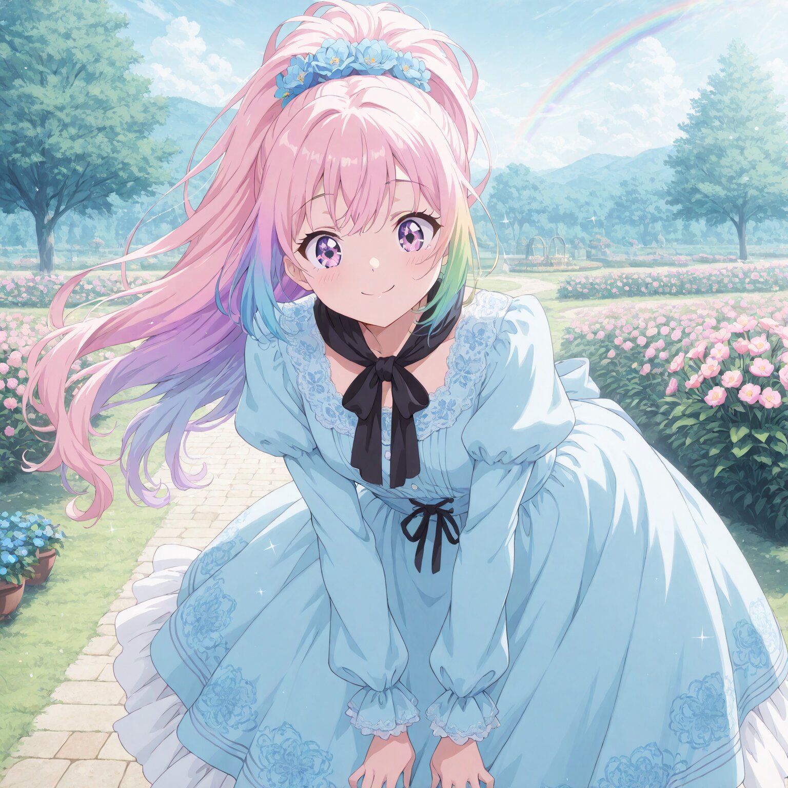 1girl, (Pale colors, rainbow-colored hair, long hair, ponytail, loose ponytail, flowing hair, beautiful hair) Purple eyes, big eyes, sparkling eyes, Glowing flower hair ornament Blue dress, Victorian dress, cute dress, ruffles, black ribbon around the neck, long sleeves, puff sleeves, flared skirt Butterfly embroidery, sparkle embroidery Leaning forward, gentle expression, playful smile Outdoors, (Garden, fantasy garden, dreamy scenery, pink flowers, blue flowers, many flowers in full bloom:1.2) BREAK, ((newest, anime, animation, anime screen capture, anime style:1.3)) BREAK, ((masterpiece, , vibrant, very aesthetic, highly detailed, best quality, 16k:1.3)) perfect fingers,