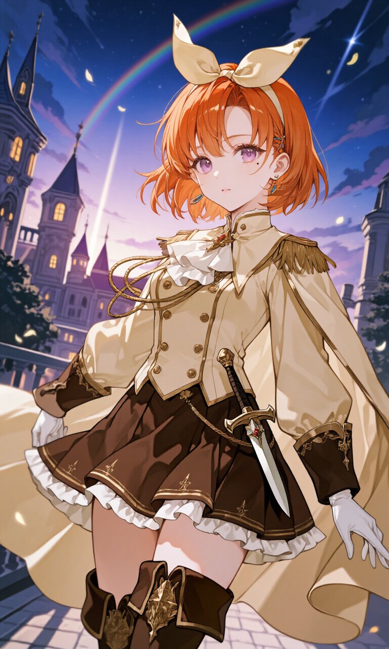 1girl, a 13-year-old girl with short orange hair and striking purple eyes, wearing a large ribbon hairband with a left mole under her eye. Her childlike yet beautiful face has delicate features, with detailed skin, expressive eyes, and finely rendered hair. She wears an (Ivory luxurious Prince costume with gold trim:1.6) with long sleeves, a (Sepia luxurious Cape:1.3), and a (luxurious Dark Brown mini skirt with White frill:1.4). Her outfit is completed with (Brown luxurious Boots:1.3), a (dagger on waist:1.3), a (crown:1.3), and (White gloves:1.2). She stands outside a retrofuturism-style palace at midnight, beneath a twilight sky with a (night rainbow:1.5) and a starry expanse. The nostalgic, romantic academia atmosphere blends with mystical elements, evoking a dreamlike yet regal presence. The background features intricate architecture, soft darkness, and a sense of whimsical fantasy.
