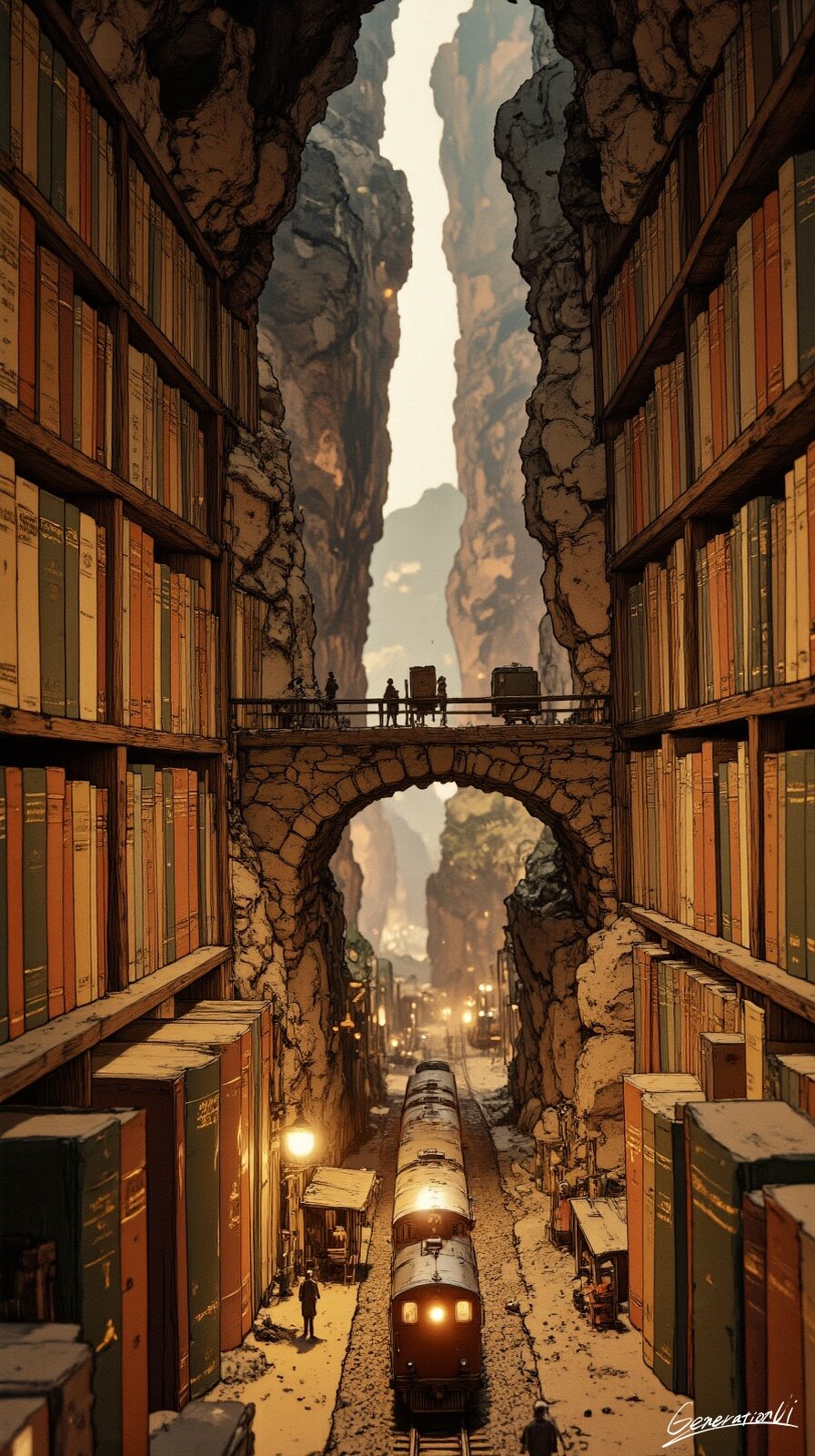 列車が大きな本棚の谷へ入ると、