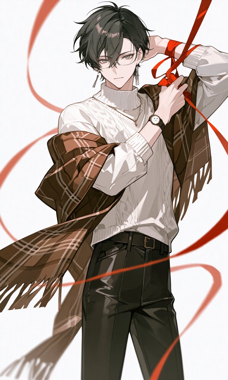 have a red ribbon wrapped around his overhead arm a delicate and elegant young Japanese man, 19 years old, with short soft black hair parted slightly to the side, pale skin, and a calm, thoughtful expression. He wears a white knit top, a brown tartan check stole, leather pants, minimal accessories, and has a modern, slightly casual yet refined look. He stands straight, full body, in a front-facing pose against a plain white background with soft shadows.
