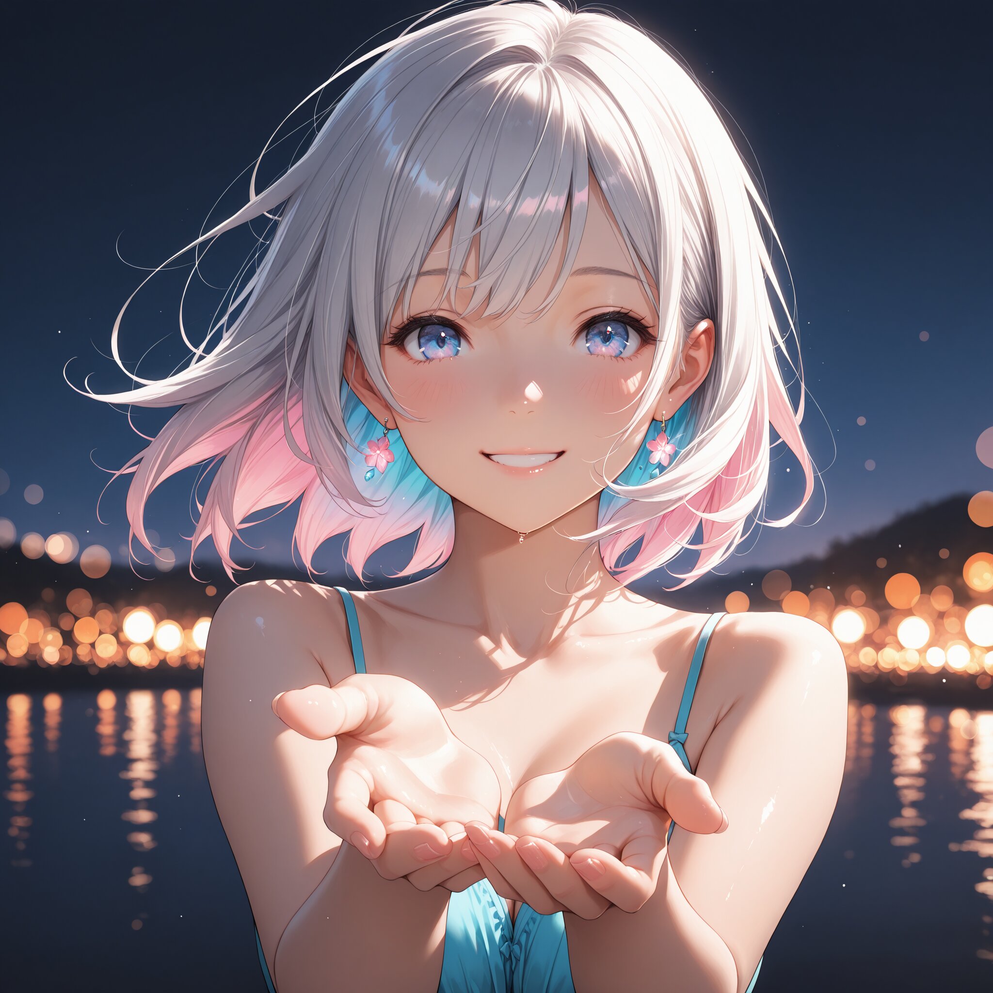 masterpiece, best quality, photorealistic, sharp focus, cinematic lighting, depth of field, beautiful composition, vibrant colors, ultra high res, 8K, highly detailed, masterpiece, best quality, very detailed, masterpiece, best quality, ultra-detailed, sharp focus, glossy, playful, beautiful girl, hand reaching forward, slightly blurred background, vibrant bokeh, energetic pose, charming smile, bright, inviting, soft glow