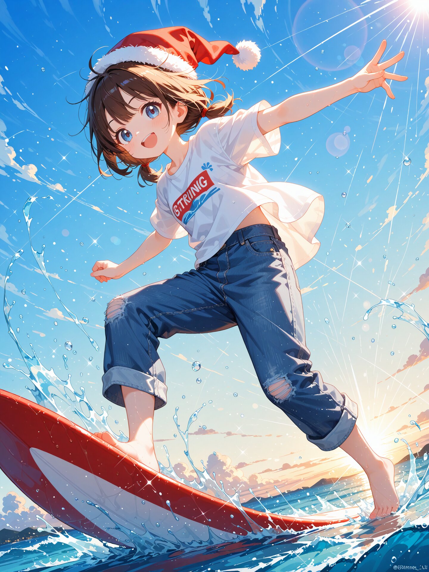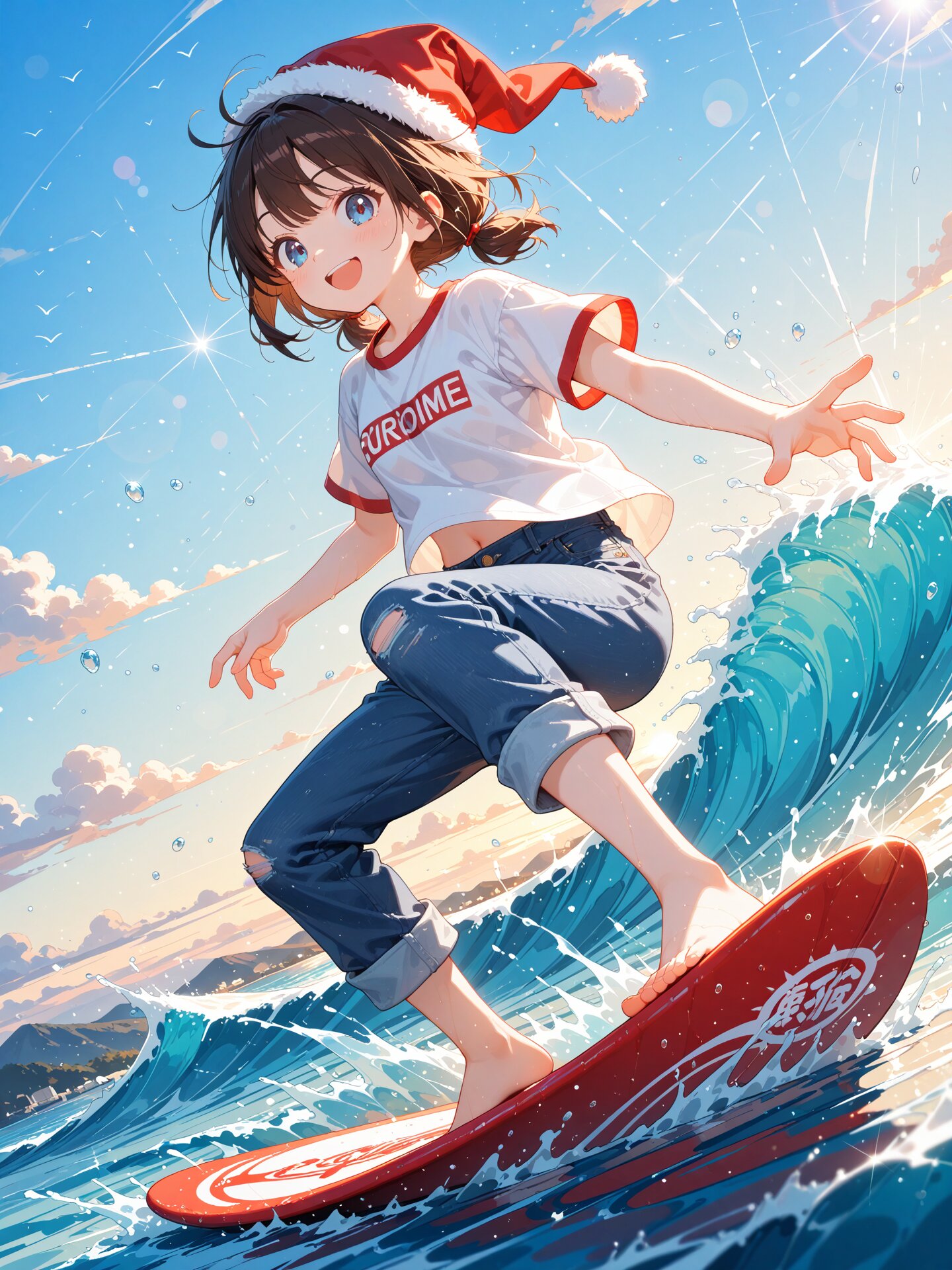 (masterpiece, best quality, ultra-detailed, anime style), 1girl, brown short hair, low twintails, dark blue eyes, white t-shirt, denim pants, red and white Santa hat, barefoot, big smile, surfing on a wave, dynamic surfing pose, balancing on a surfboard, riding a big wave, splashing water, energetic motion, action shot, daytime, sunny beach, bright sky, strong sunlight, sparkling ocean, blue sky, warm lighting, wind blowing the dress and hair, lively atmosphere, vibrant colors,shine colorful, <lora:Shine_colorful_XL_8R5C5A5B:1>