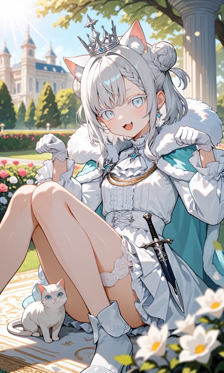 A 10-year-old girl with white hair styled in two side-up buns and medium-length braided bangs, her pale blue eyes accentuated by (white colored eyelashes), gives a playful :3 expression with a visible fang. She wears cat ears atop her head, enhancing her mischievous charm. Her outfit is a (White luxurious Prince costume:1.5), complete with a (Pastel light Blue luxurious Cape:1.3), a (luxurious White mini skirt with white frill:1.3), and a delicate (lace jabot:1.2). A (dagger on waist:1.3) and a (luxurious crown:1.3) add regal flair, while (White luxurious gloves:1.2) and long sleeves complete the ensemble. She sits on a luxurious square carpet in a palace’s (in the flower garden:1.5), knees drawn up in a paw pose, with a white kitten beside her. The afternoon sunlight casts soft beams and lens flares, bathing the scene in a warm, romantic academia atmosphere. The background features a grand palace, blooming flowers, and a serene, calm ambiance. The artwork is insanely detailed, with a strong focus on her face and upper body, showcasing intricate textures in her hair, skin, and clothing. Masterpiece quality, 16K resolution.