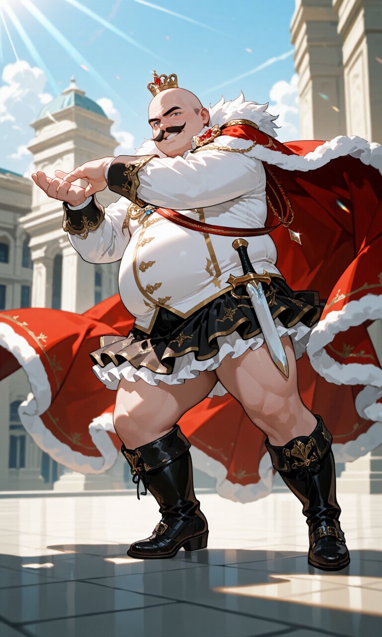 A middle-aged man with a bold yet beautiful face stands confidently in a dancing pose, his short hair and bald head gleaming under the sunlight. His narrow eyes, framed by a well-groomed mustache, carry a mischievous smirk as he grins at the viewer. Despite his brawny and slightly fat physique, his delicate facial features, including stunning eyes and detailed skin, exude charm. He wears a (White luxurious Prince costume with gold trim:1.6) adorned with intricate embroidery, paired with a (Red luxurious Cape:1.3) that billows dramatically behind him. His lower attire consists of a (luxurious Black mini skirt with White frill:1.4), revealing his bare thighs, and (Black luxurious Boots:1.3) with ornate buckles. A gleaming (dagger on waist:1.3) and a (luxurious crown:1.4) complete his regal yet eccentric ensemble. The background features brutalist architecture softened by romantic academia aesthetics, set outside a grand palace in the afternoon. Sunbeams filter through the blue sky, casting shining lights that enhance the lighthearted, whimsical atmosphere. The image is rendered in insanely detailed 16K quality, emphasizing textures in fabric, skin, and surroundings, making it a true masterpiece.
