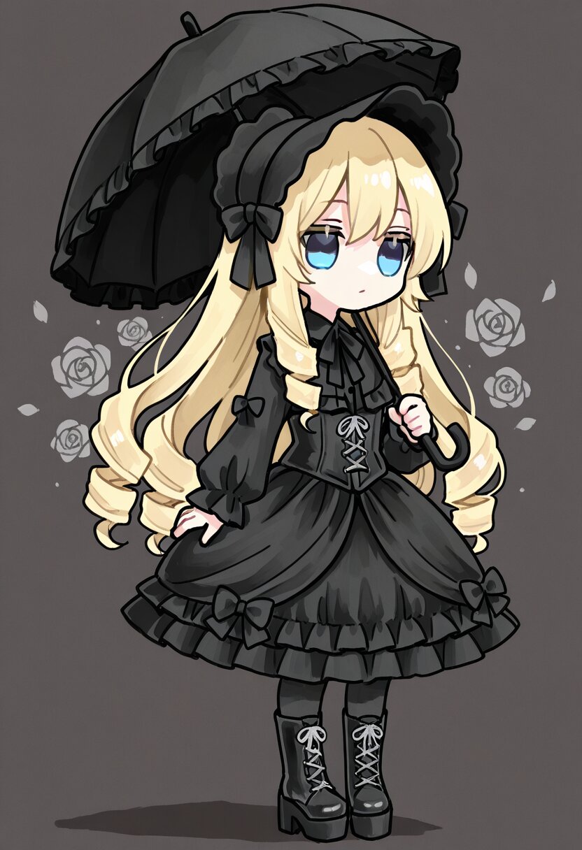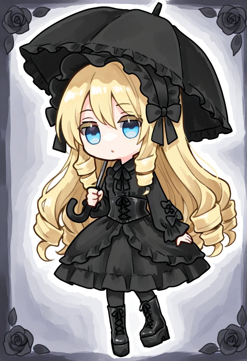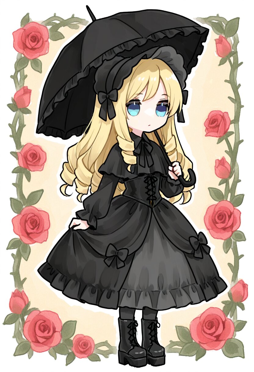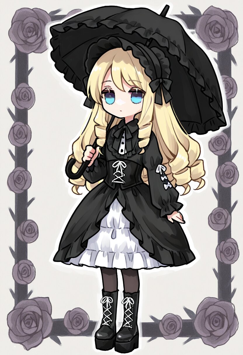 <lora:inmnstyleilxl:0.9>, best quality, masterpiece, very aesthetic, watercolor painting, general, 1girl, chibi, solo, blonde hair, long hair, ringlets, blue eyes, gothic lolita fashion, black frilly headwear, redrose ornament, black and white dress, lace-up corset, long sleeves, many frill, many ribbon, layered skirt, voluminous skirt, black tights, black platform boots, holding black umbrella, frilly umbrella, rose background