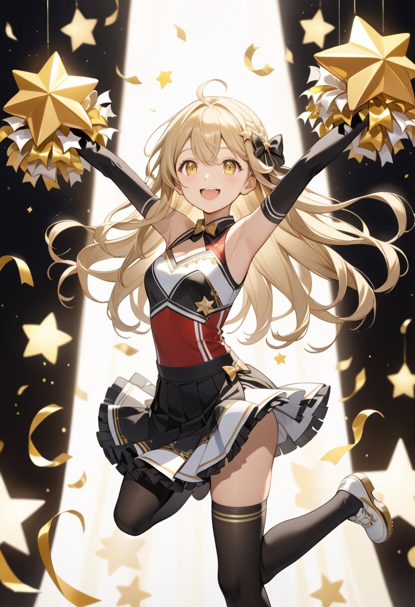 best quality,absurdres,8k,ultra detailed,full body,A young, light-skinned anime-style girl, likely in her teens, is depicted, radiating joy and excitement. She's dressed in a cheerleading-like outfit with a black and white bodice adorned with gold accents, a matching short skirt, and high black stockings. Her light blonde hair is styled in long, flowing locks, accented by large black bows with floral embellishments. She has large, expressive eyes and a cheerful, open-mouthed smile, enhancing her playful pose. Her arms are raised, holding ornate bouquets with plush bear toys, which are a mix of light yellow and golden decorations. The lighting is bright and soft, casting subtle shadows and highlights that accentuate her features and the details of her clothing and accessories. The background consists of a soft, blurred effect with star-shaped decorations. The overall composition is dynamically oriented, with the girl positioned in the center, creating a sense of energy and celebration, suggesting a festive and joyful atmosphere.