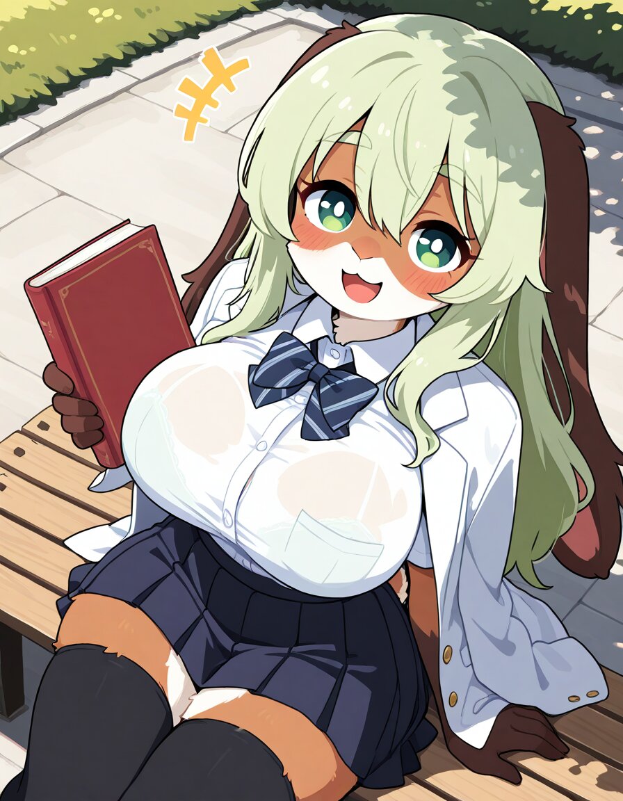 1girl, tall, lop rabbit girl, furry, brown fur, rabbit ears, lop rabbit ears, rabbit tail, fluffy fur, huge breasts, curvy, narrow waist, wide hips, light-green hair, long hair, light-green eyebrows, well-groomed hair, hair between eyes, narrow eyes, light-green eyes, white jacket, jacket on shoulders, undersized clothes, white collared shirt, stripe bow, bowtie, see-through silhouette:0.8, see-through shirt, black pleated skirt, black thigh highs, skindentation, deep skin, smile, open mouth, laughing, +++, tilted head, sitting on a plastic bench, outdoor, holding a book, foreshortening, perspective, looking at viewer, from above, high angle, hair shade, low contrast, digital art:1.1, anime coloring, kawaii, softy, 2D, cute, solo, correct_anatomy, Bright colors, Contour line, pale painting, detailed_hands:1.5, flat color, no lineart, close-up, eye focus, gddw, furry, two tone fur, furry body, perfect body, detailed face, high quality, cute clothes, animal tail, animal ears, solo, big breasts