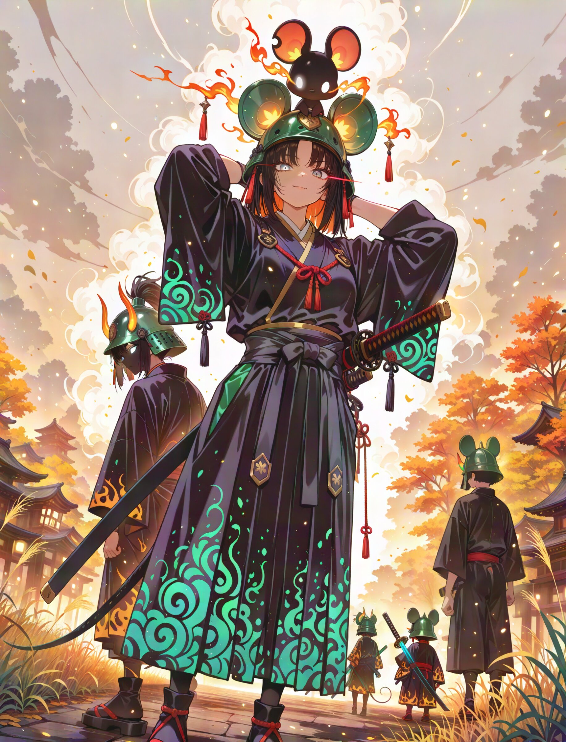 from behind, looking another, feet out of frame from below, looking down looking at viewer, (dutch angle:1.2), autumn atmosphere, earthy color, glowing amber mouse energy, amber silhouette of serious mouse guardian, huge mouse aura, 1girl, samurai, (muscular male:0.5), black hair, crew cut, parted bangs, straight hair, glowing eye, eye trail, beautiful grey eyes, ,, mouse ears, mouse tail, (holding Japanese ever green sword:1.3), scabbard, (checkerboard pattern kimono:1.1), (stylish ever green japanese helmet:1.1), egasumi, sandals, tabi, (respectful smile:1.2), , arms behind head (swirling ink effects:1.2) fleeing, beautiful metallic luster, sharp katana, ultra detailed katana, silver particles, light trail, The background is a solid, bright amber, creating a striking contrast with the intricate, multi-colored design of the character, (a lot of silhouette:1.0), pop color background, (high saturation:1.2), drop shadow, ink-drenched shadows, solid black shadow blocks, abstract ink swath background, heavy chiaroscuro, high-contrast inky shading, negative space, grunge texture, calligraphic strokes, susuki grass, super fine concept art, unreal engine, graceful eyes, masterpiece, best quality, amazing quality, very aesthetic, absurdres, newest, professional art lots of details, , overexposure, sumie effect style, 4ur4_illu,shiny, glowing, glowing particles, glowing light particles, light particles, ice fog , <lora:noline (1):-0.5> <lora:sdxl2-flat2-512b:0.15> <lora:facelightup_xl_v10:0.5> <lora:V2_yakumo_alchemy:0.5> <lora:Aura_illu:0.1>