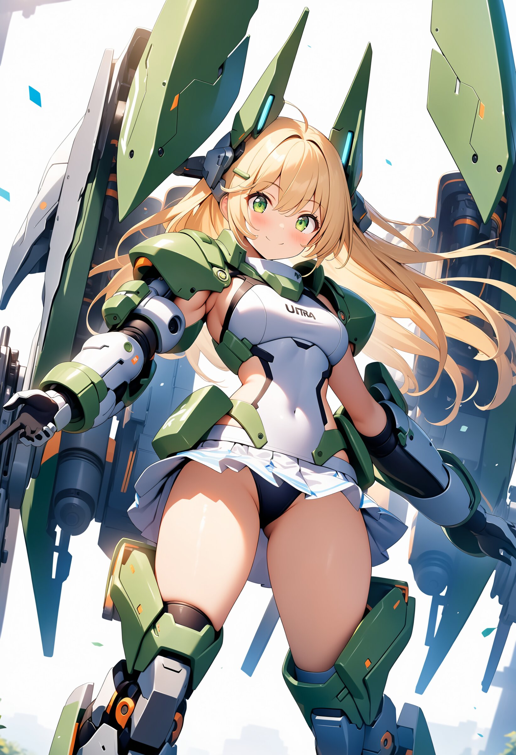 1girl, ((white background)), ultra detailed 8k cg render, masterpiece, high resolution, extremely detailed, mecha musume,mecha shoulder, mech leg, headgear, mecha armor, ((mini skirt)),long blonde hair, dropping green eyes, smile, dynamic posing,