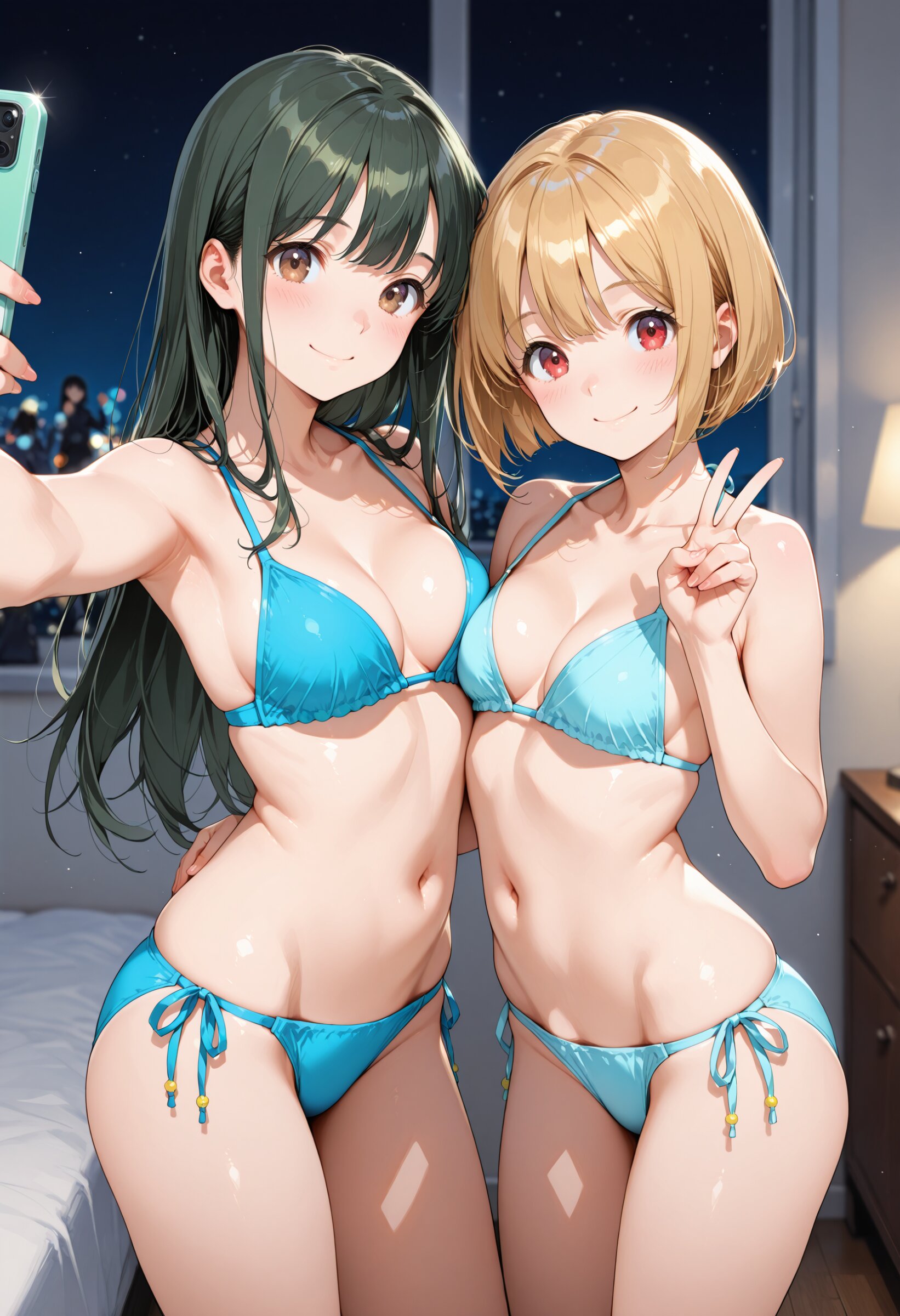 masterpiece, best quality, ultra-detailed, high resolution, perfect anatomy, beautiful detailed eyes, beautiful detailed face, two girls, best friends taking a selfie, your girl: dark green long hair, red eyes; friend girl: blonde bob cut, brown eyes, playful smile; both making peace signs, leaning close, smartphone held up, cute pose, fun vibe, room, night, blurred background