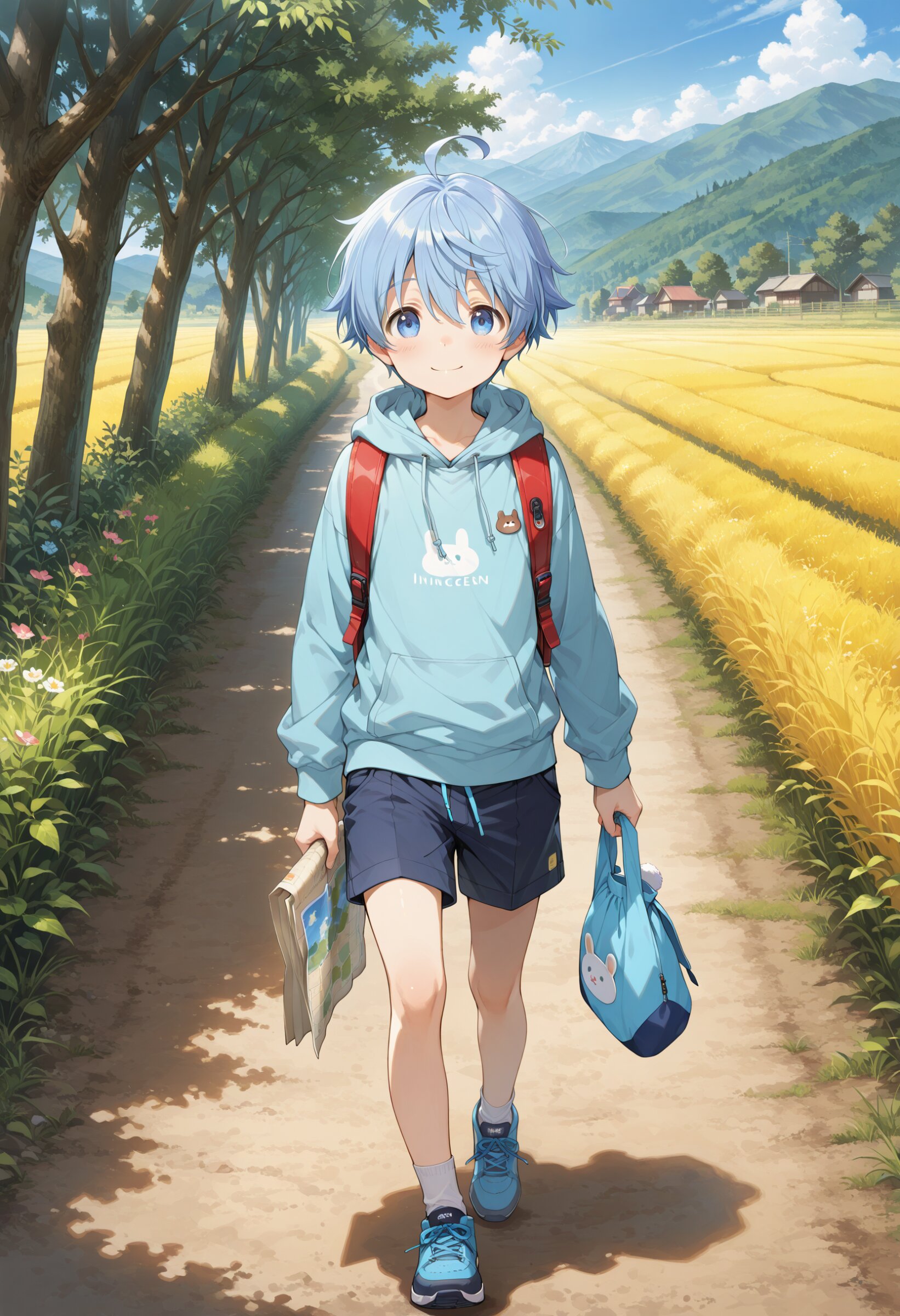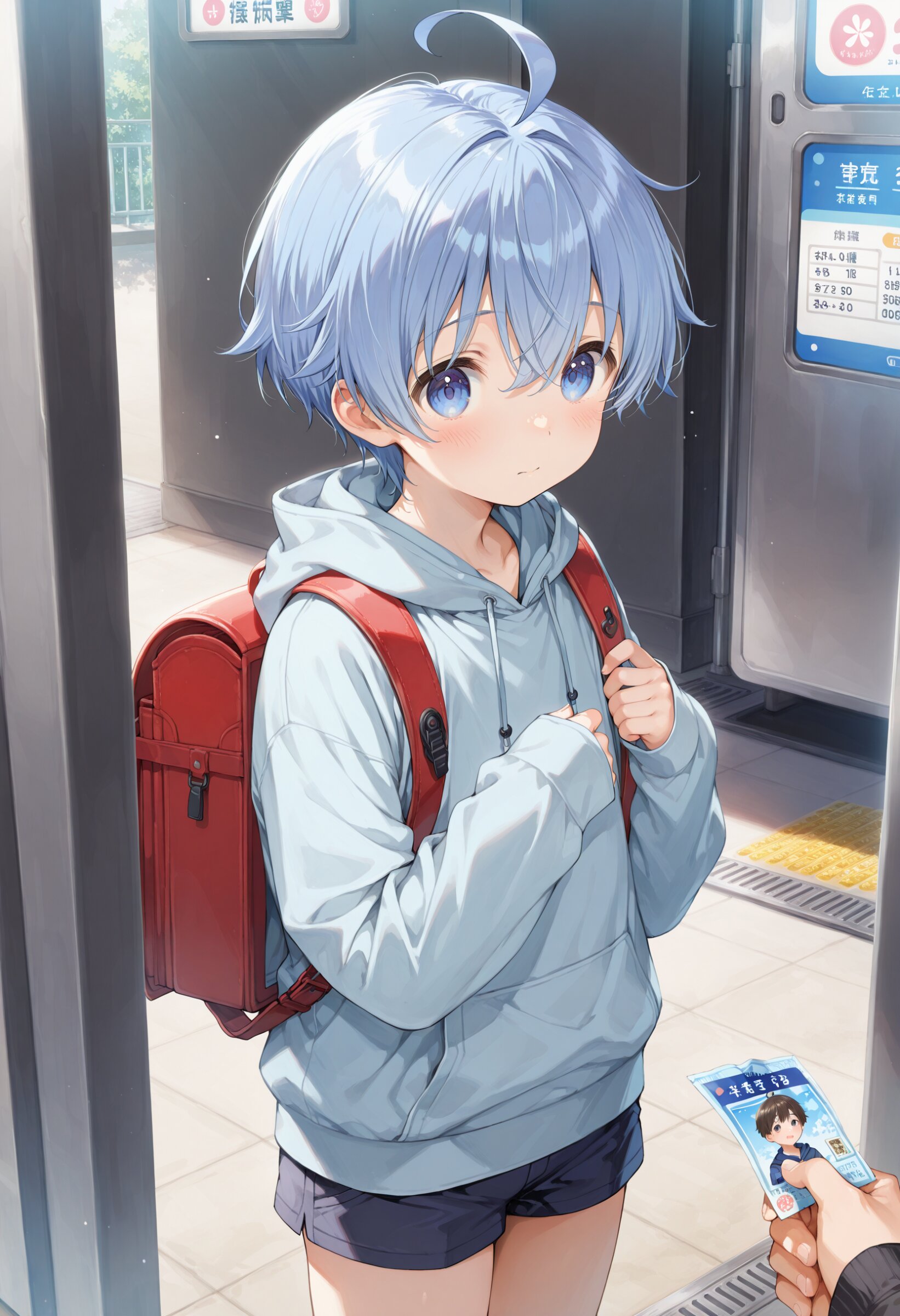 masterpiece, best quality, amazing quality, general, fine detail, official art, 1boy, kawaii, shota, ahoge, light blue hair, hoodie, short pants, long sleeves, moe sode, Sleeves past wrists, Hold the little ticket in one hand, ticket gate, Carry a small cloth backpack, innocent expression,