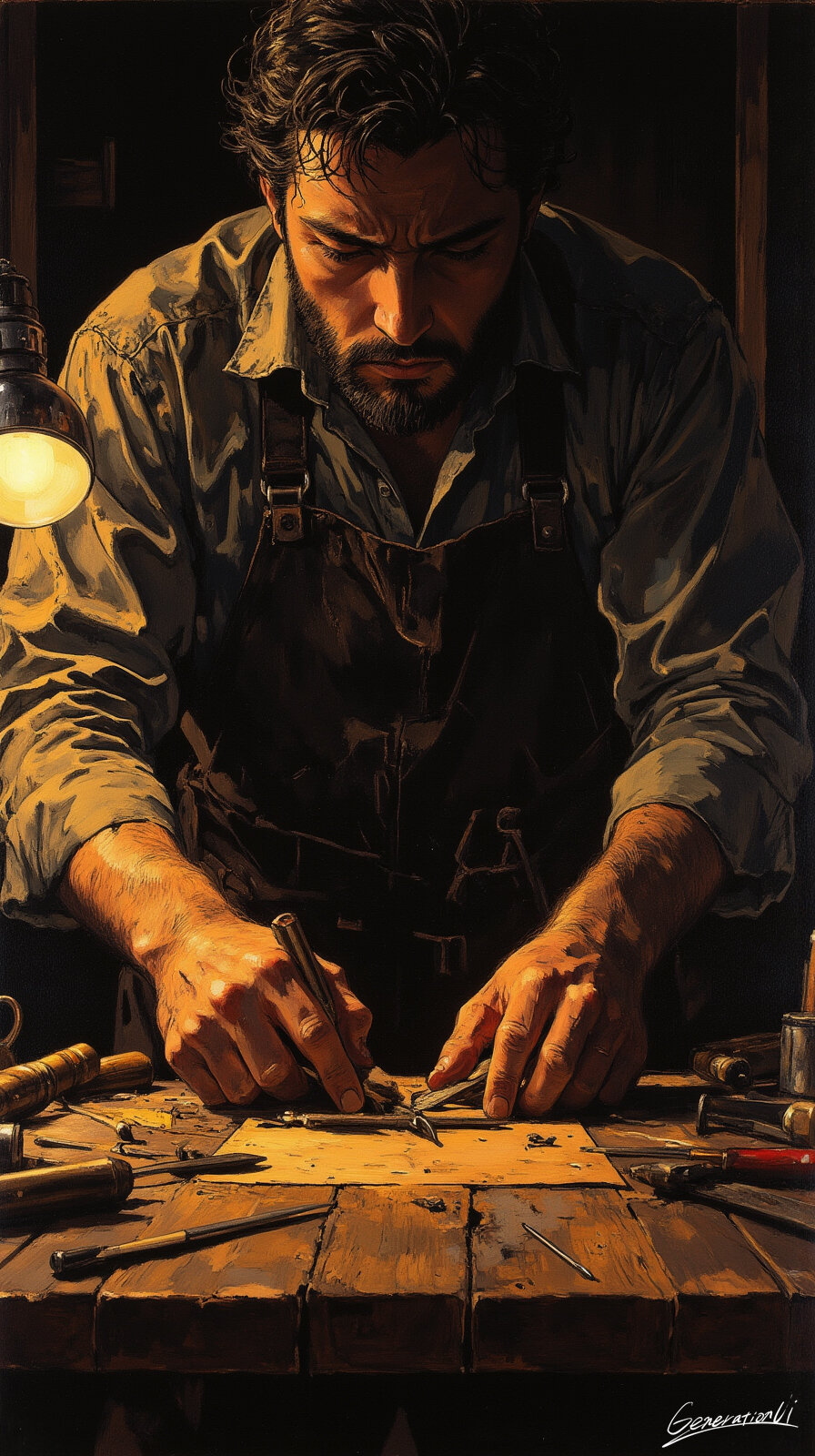 深夜の工房は、作業灯の丸い光だけが世界を形づくっていた。