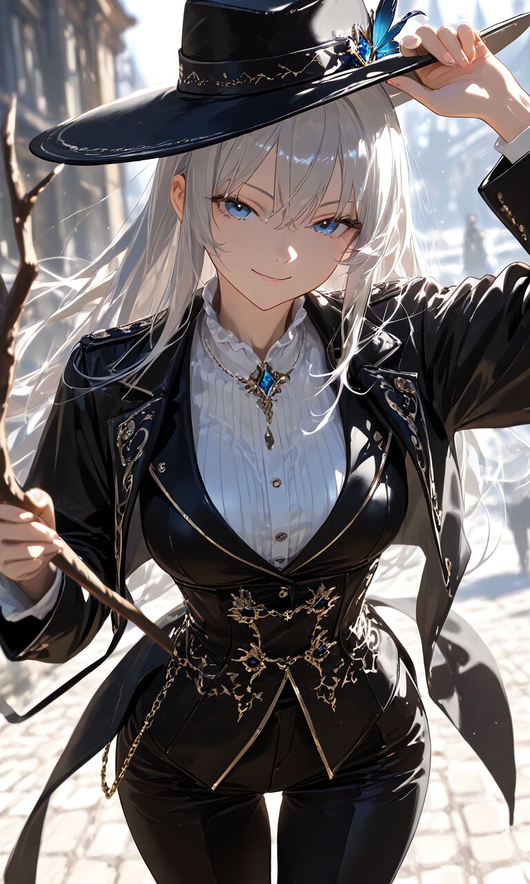 (best quality),(masterpiece),(ultra detailed),1 lady, long hair, silver hair, blue eyes, seductive smile, black jacket, black pants, black hat, holding stick