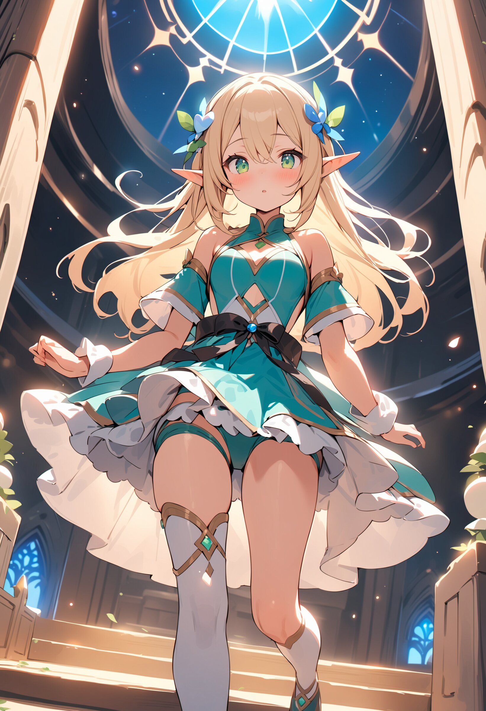 ((masterpiece)), ((best quality)), ((kawaii)), cute, (lovely), ((extremely detailed)), (beautiful), dynamic angle, sacred place, a cute girl, 1girl, solo, ((elf )),beautiful blond hair, beautiful green eyes, ((beautiful eyes)), long hair, fantasy clothes,