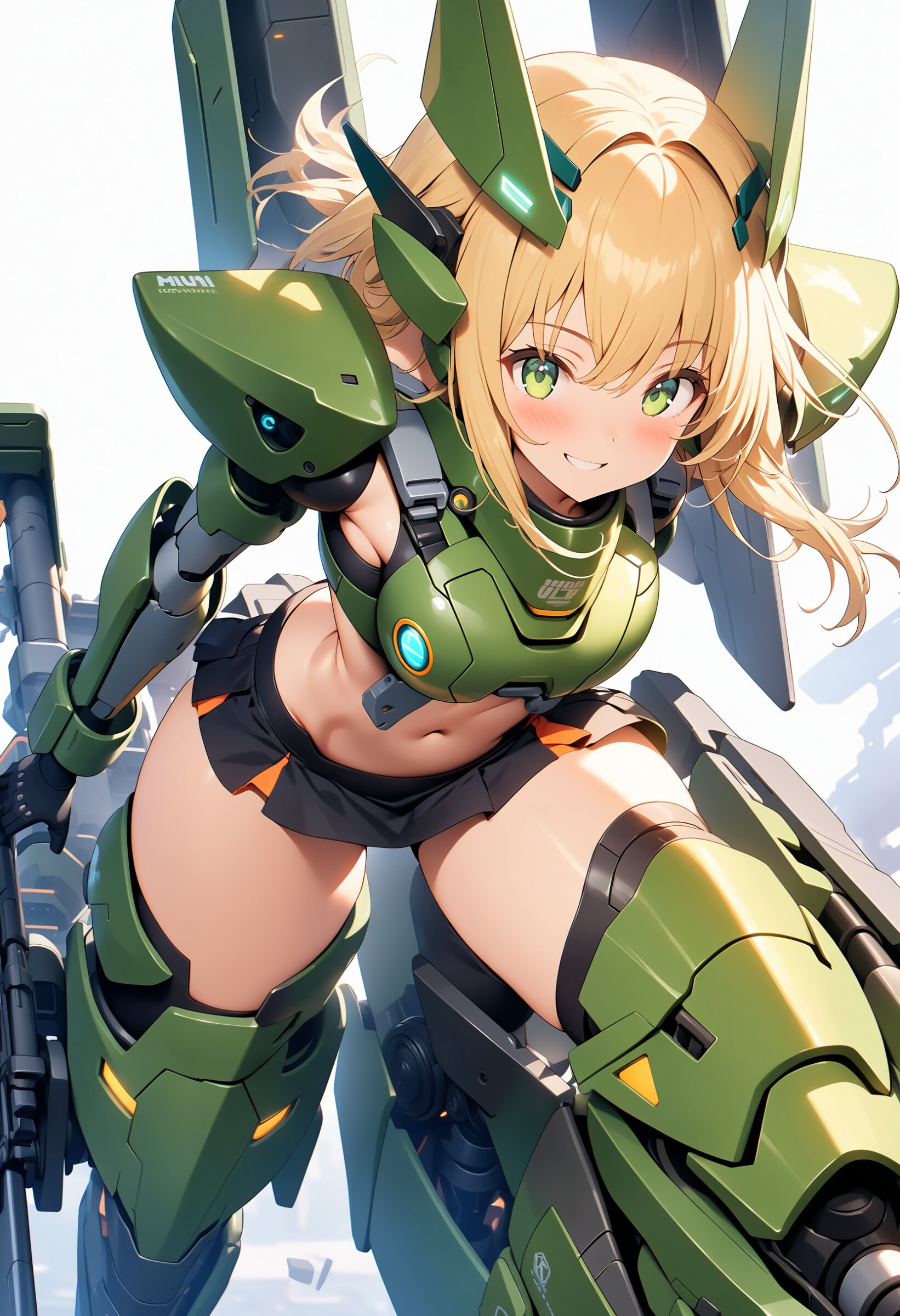 1girl, ((white background)), ultra detailed 8k cg render, masterpiece, high resolution, extremely detailed, mecha musume,mecha shoulder, mech leg, headgear, mecha armor, ((mini skirt)),long blonde hair, dropping green eyes, smile, dynamic posing,