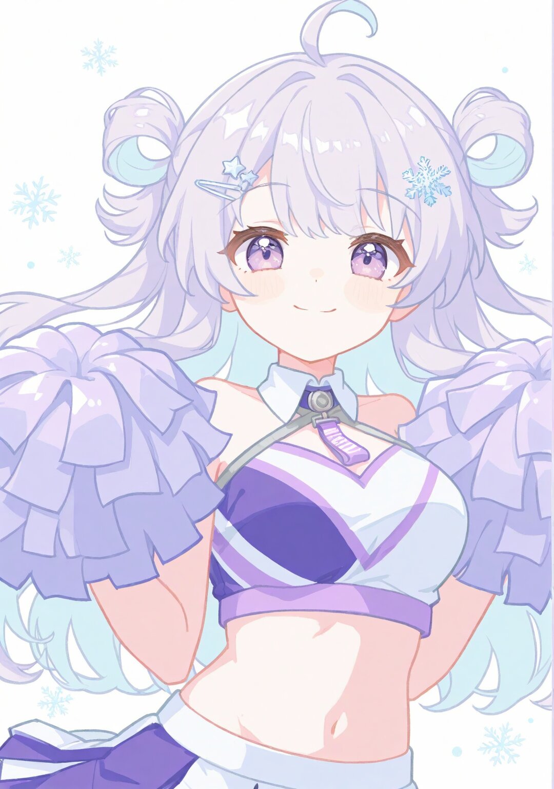 cheerleader outfit (winter version), white-blue color scheme, pom-poms sparkling, snowflakes falling, bright sky background, joyful smile, solo, kawaii, cute, dynamic pose, dynamic angle, looking at viewer, (soft pastel color palette:1.5), (pale colors:1.3), watercolor texture, matte finish, subtle shading, minimal contrast,, Pastel color palette, (Upper body: 0.9), soft cute girl with soft lavender hair and light blue inner highlights, long hair with two side buns and loose curls, one stray hair, large, bright purple eyes, a gentle smile, a faint glow, anime-style with emphasized contours, flat pastel-toned shading.single ahoge, medium breasts,star-shaped hairpin,
