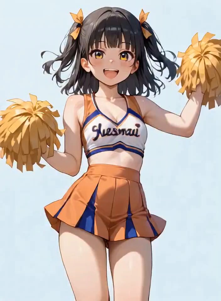 cheerleader,miniskirt,kneehighs,:d,happy,light_blush,Two Side Up Hair,1girl,loli,bishoujo,mesugaki,underage,black hair,small_breasts,slender_waist,hands on thighs,showcasing cleavage,emphasize the cleavage,posing,waving,