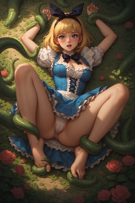 ウサギを追いかけて不思議の国に迷い込んだアリス。クイーン・オブ・ハートの庭園で一息つこうとしたその瞬間、事件は起きた! 突如、地面からニョロニョロと現れた触手がアリスを襲撃! 絡みつく触手に翻弄され、スカートがひらり、パンチラし放題のピンチ! だが、このアリス、ただの夢見る少女じゃない。動じることなく、鋭いナイフを手に取り、キラリと目が光る。「パンチラ? そんなの気にしてられない!」とばかりに、華麗なハイキックで触手を次々撃退!
