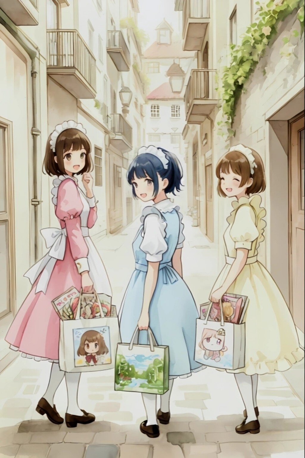 Three girls in maid outfits are walking down a street. Each one is carrying a shopping bag and smiling as they converse. The girl on the far left is wearing a pink maid outfit, the girl in the middle is wearing a light blue maid outfit, and the girl on the far right is wearing a cream-colored maid outfit. The background is a European-style cobblestone alleyway, with a building with a balcony and green plants growing over it. The overall illustration is bright and vivid in pastel colors, in a watercolor style.