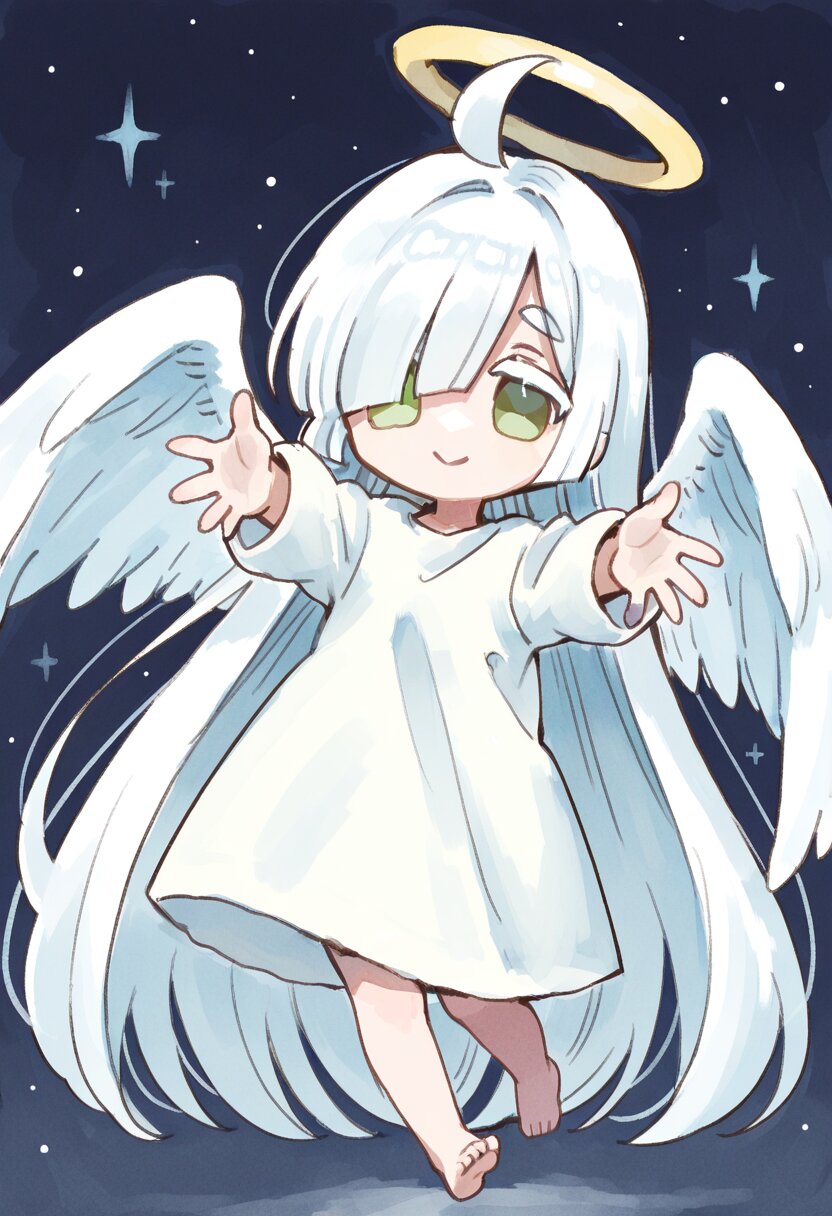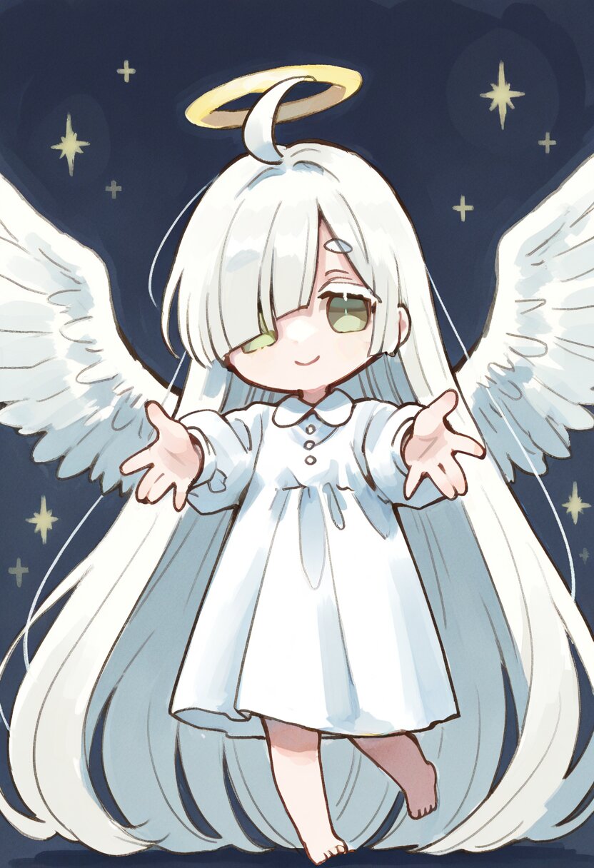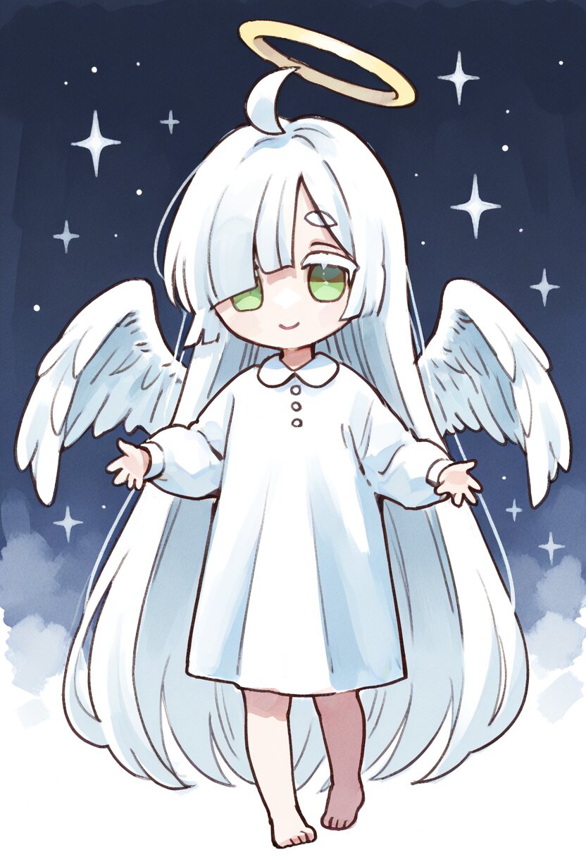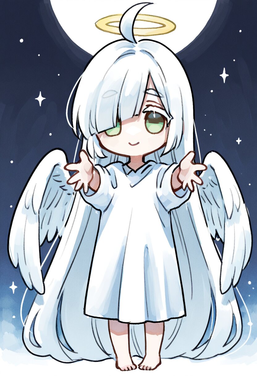<lora:inmnstyleilxl:0.9>, best quality, masterpiece, very aesthetic, watercolor painting, general, 1girl, chibi, solo, (bright white hair), absurdly long hair, blunt bangs, white thick eyebrow, white colored eyelashes, (hair over one eye), ahoge, mintgreen eyes, large angel wings, halo, white longsleeves dress, barefoot, reaching, smile, night sky background