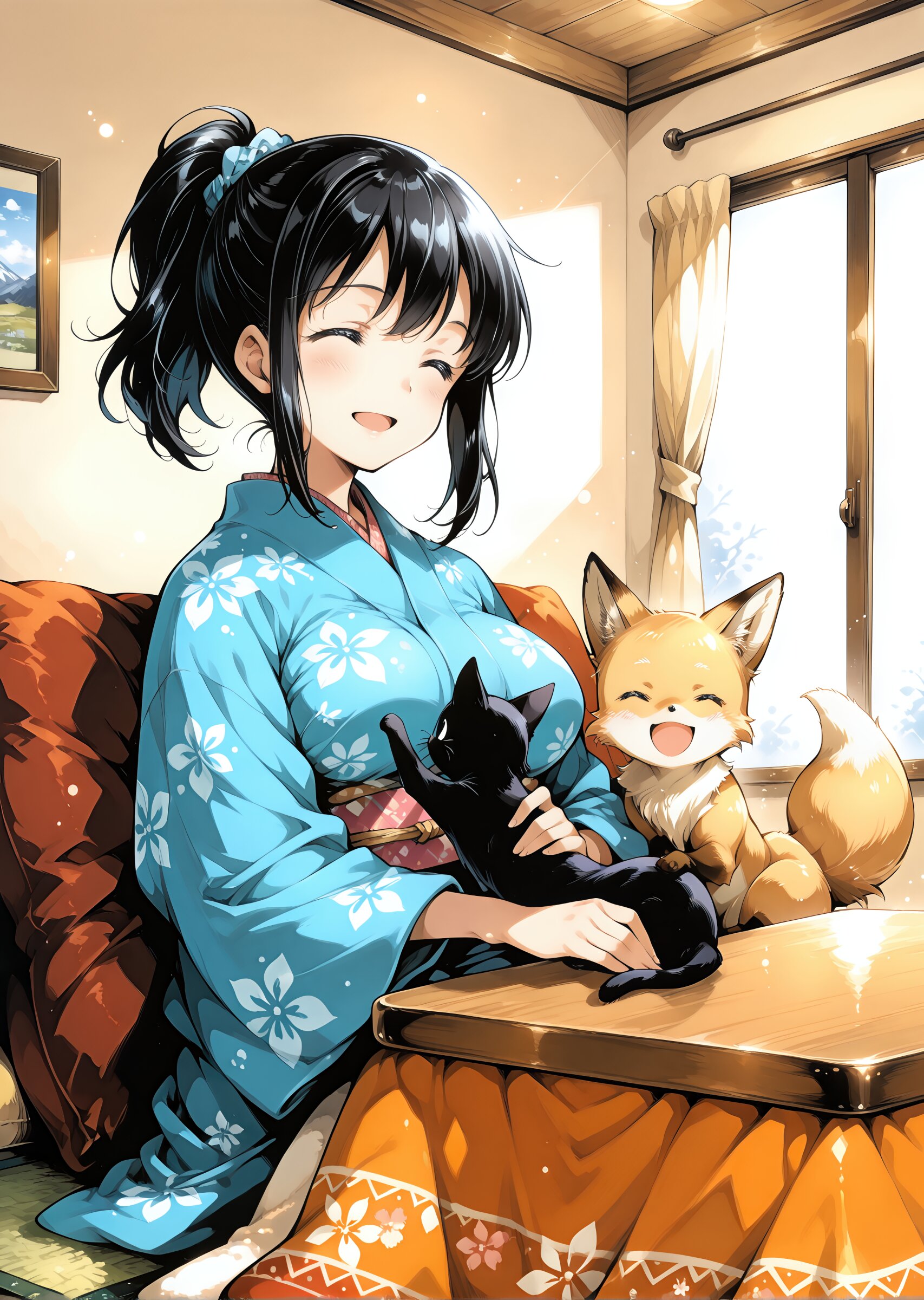 Best quality, Masterpieces, simple background, negative space, anime-style illustration, fine detail, 1cute small fox cub with 1black cat, relaxing in retro Showa living room, kotatsu with classic patterned quilt, old radio, soft winter daylight, cozy nostalgic atmosphere, peaceful daytime, happy, no humans, and 1girl, 1girl, (young girl), cute face and eyes, big breasts, black hair, clear black eyes, single short ponytail hair, cute and lovely, Vigorous, lively, and spontaneous personality, smile, open mouth, closed eyes