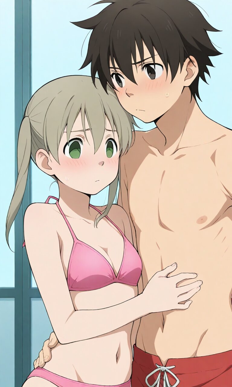 Couple, boy and girl, two people only,absurdres, ultra-detailed, master piece, high resolution, 8k, Boy, girl, a girl in a bikini is laying in the air over a young man, 1girl, 1boy, swimsuit, bikini, breasts, blush, BREAK the boy(original boy,black eyes, black short hair) BREAK the girl(maka albarn, blonde hair, twintails, green eyes, bangs, anime screencap ),
