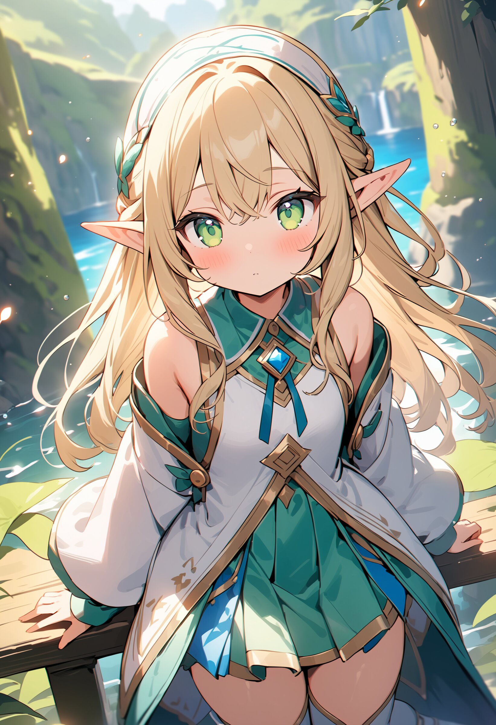 ((masterpiece)), ((best quality)), ((kawaii)), cute, (lovely), ((extremely detailed)), (beautiful), dynamic angle, sacred place, a cute girl, 1girl, solo, ((elf )),beautiful blond hair, beautiful green eyes, ((beautiful eyes)), long hair, fantasy clothes,
